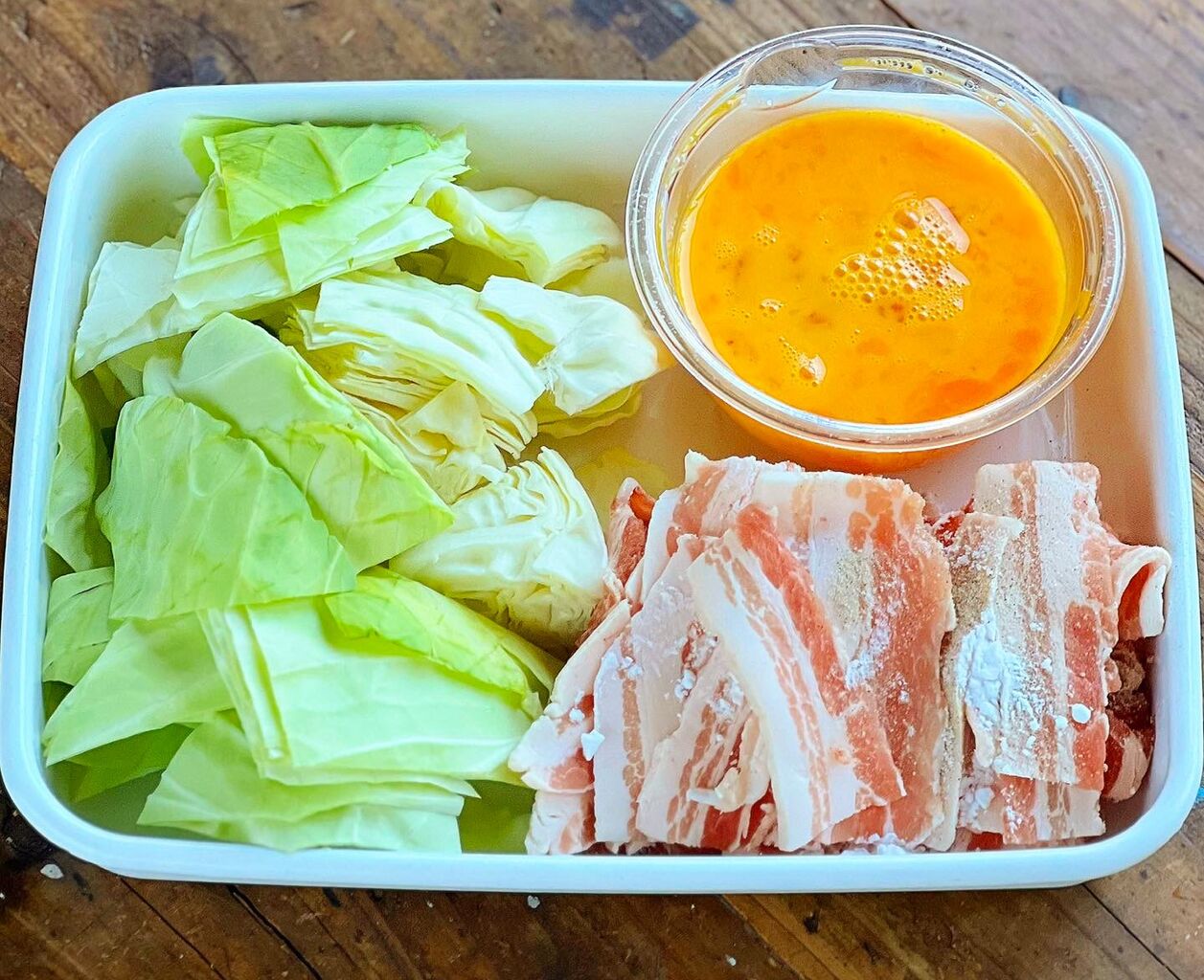 1.豚肉は5cm長さに切り、塩こしょうと片栗粉をまぶす。キャベツはざく切りにする。卵は溶きほぐす。