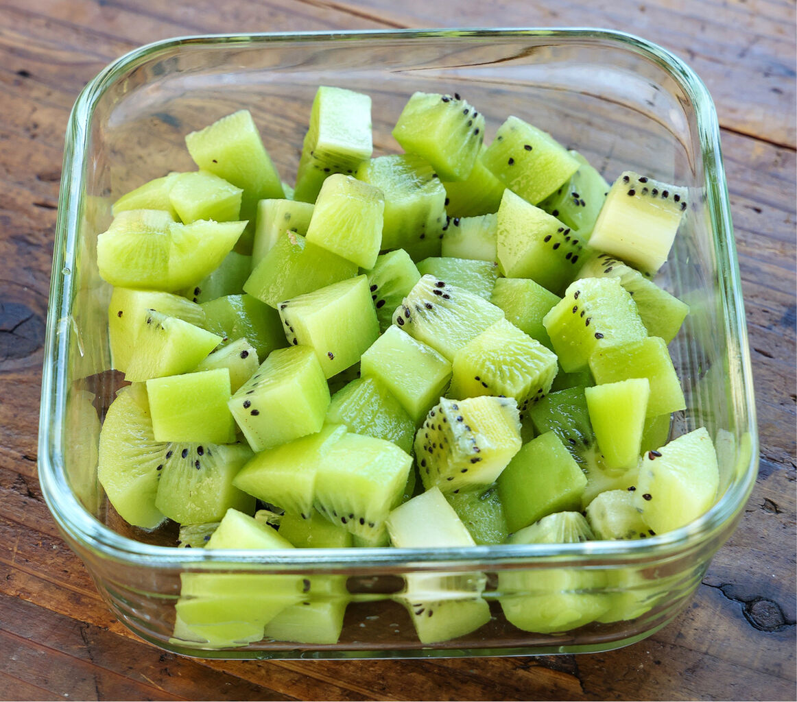 1.キウイは皮を剥いて2cm角に切る。