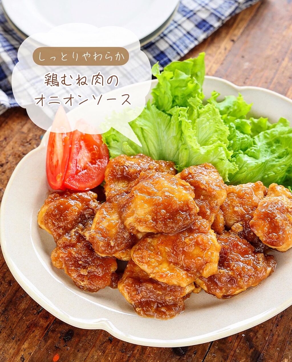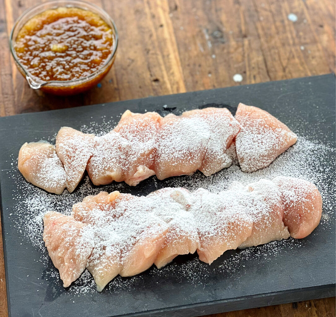 1. 玉ねぎはすりおろして●と合わせる(←ソース)。鶏肉はフォークで刺し、一口大の削ぎ切りにし、塩こしょうを振って薄力粉をまぶす。