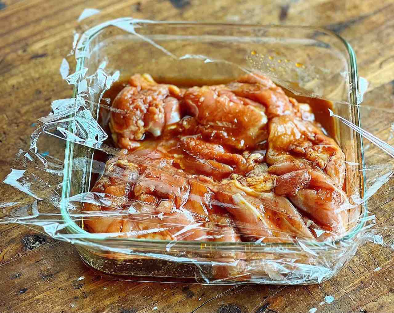 2.耐熱容器に●と鶏肉を入れて揉み込み、(鶏肉の皮を下にして)ふんわりラップをかけ、600Wのレンジで6分加熱する。
