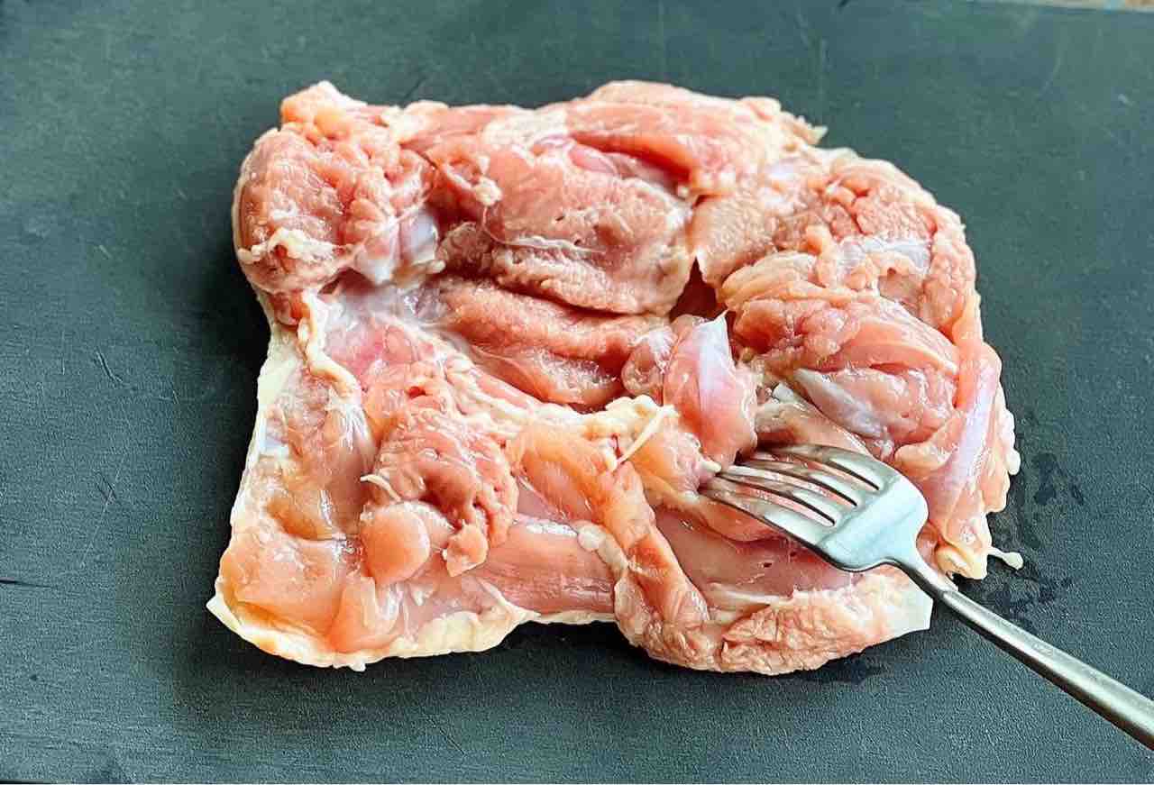 1.鶏肉は全体をフォークで刺す(身の厚い部分があれば開いておく)。