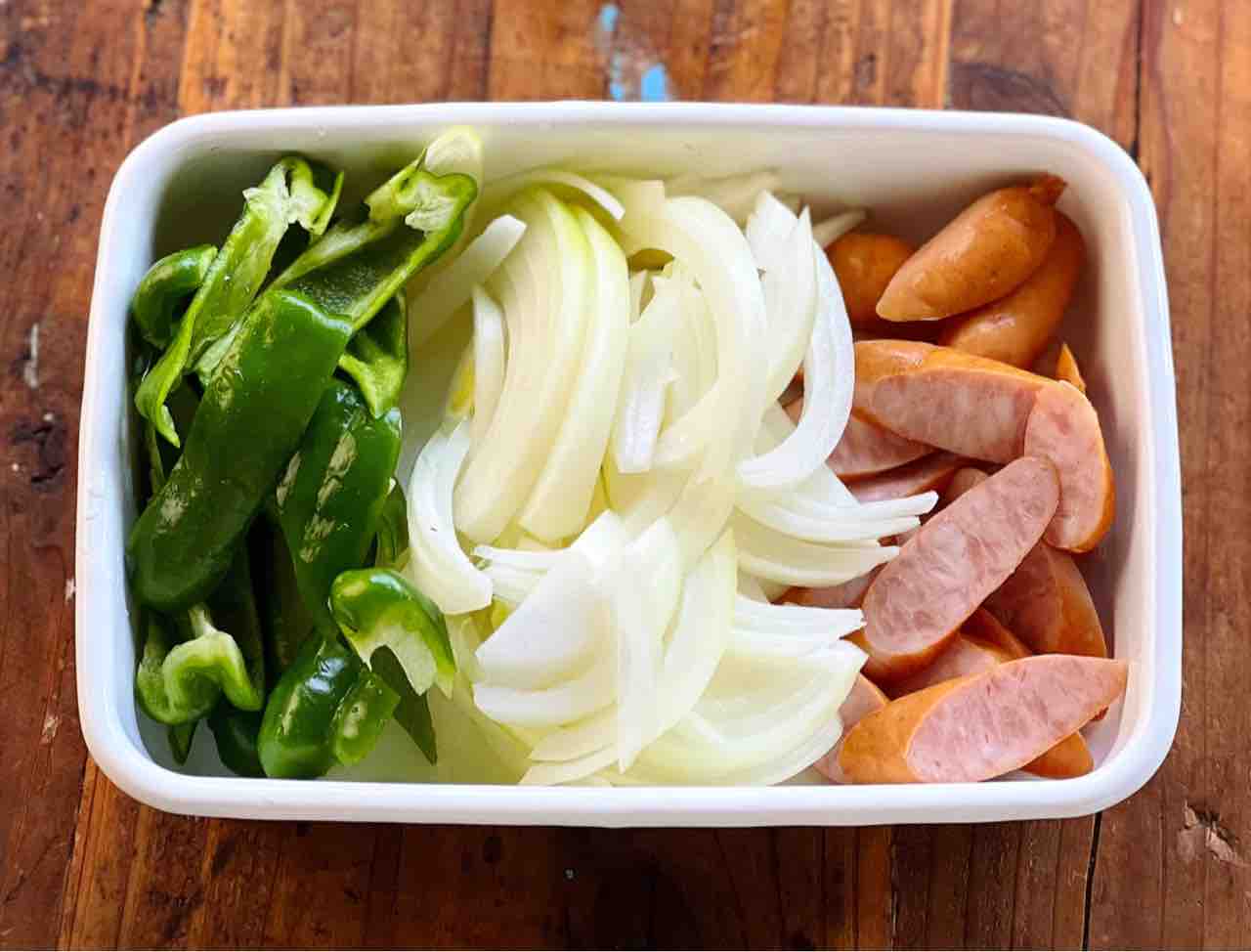 1.ウインナーは斜め薄切り、玉ねぎは薄切り、ピーマンは一口大に切る。