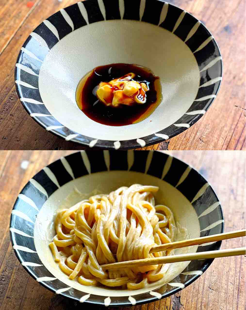 2.器に●と1を入れて和え、ねぎと卵黄をトッピングする。