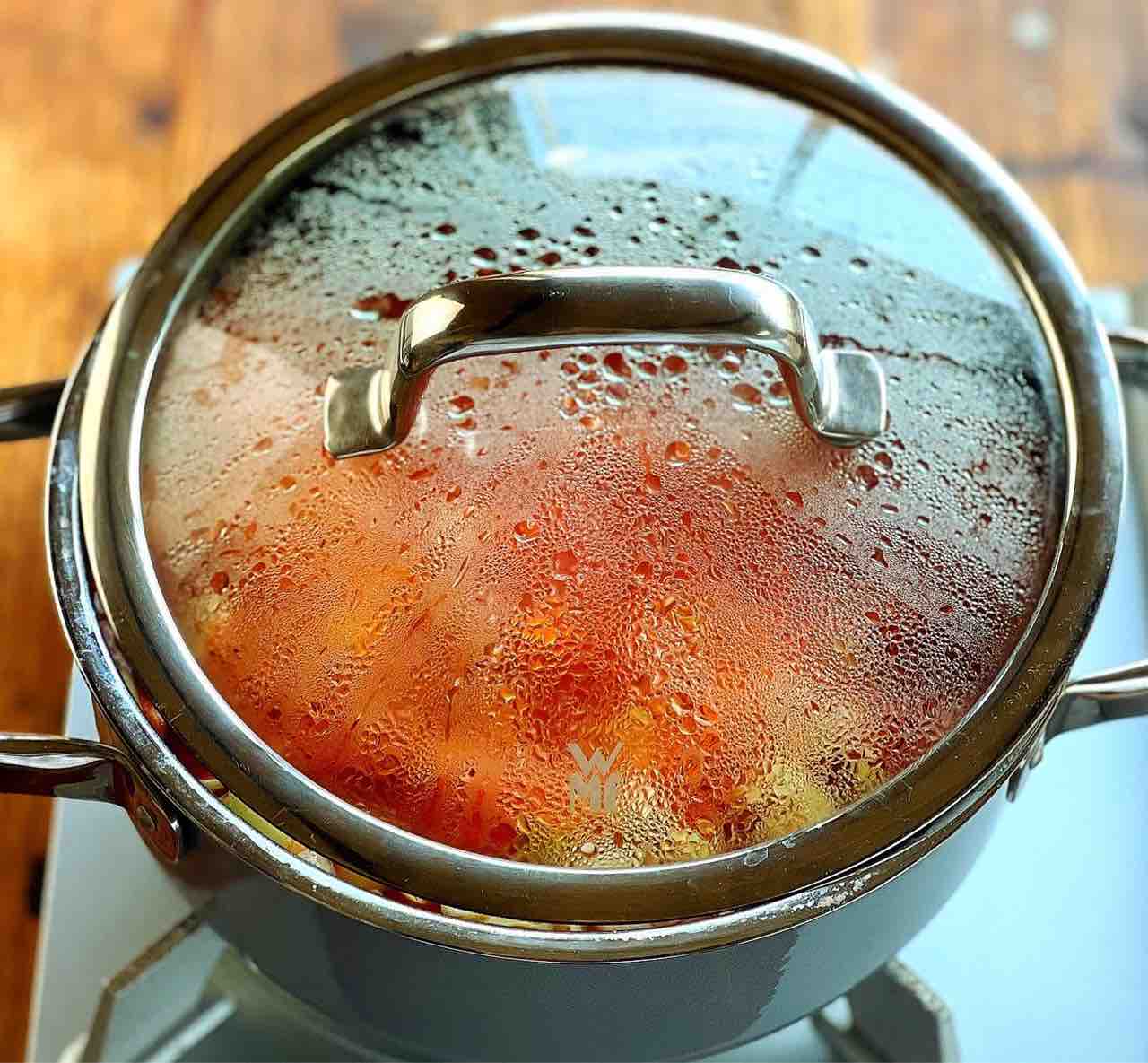 2.鍋に1と⚫︎を入れ、ざっくり混ぜて火にかける。煮立ったら蓋を少しずらしてのせ、弱めの中火で15分程煮る。