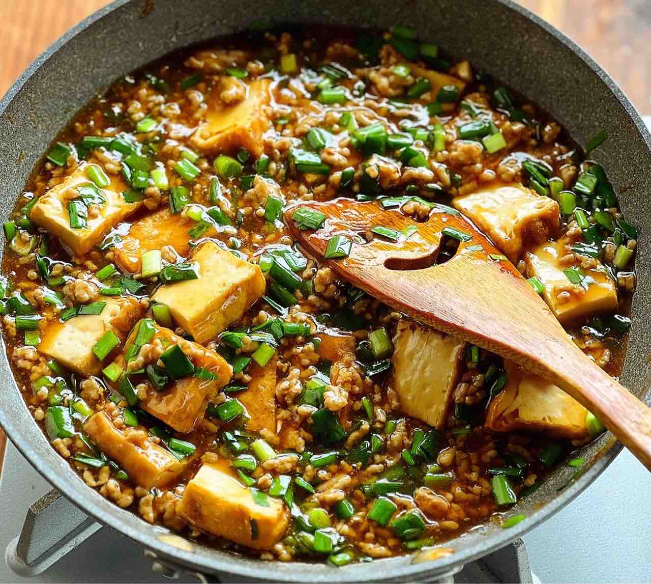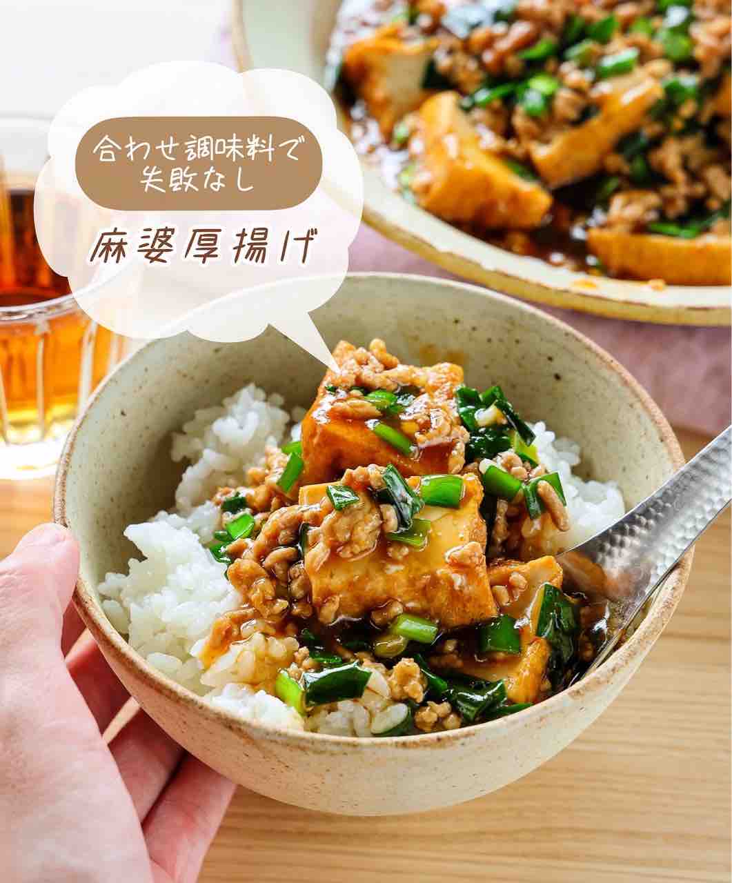 2.フライパンにごま油と豆板醤を入れて中火で熱し、ひき肉を炒める。火が通ったら厚揚げも加えて更に炒める。