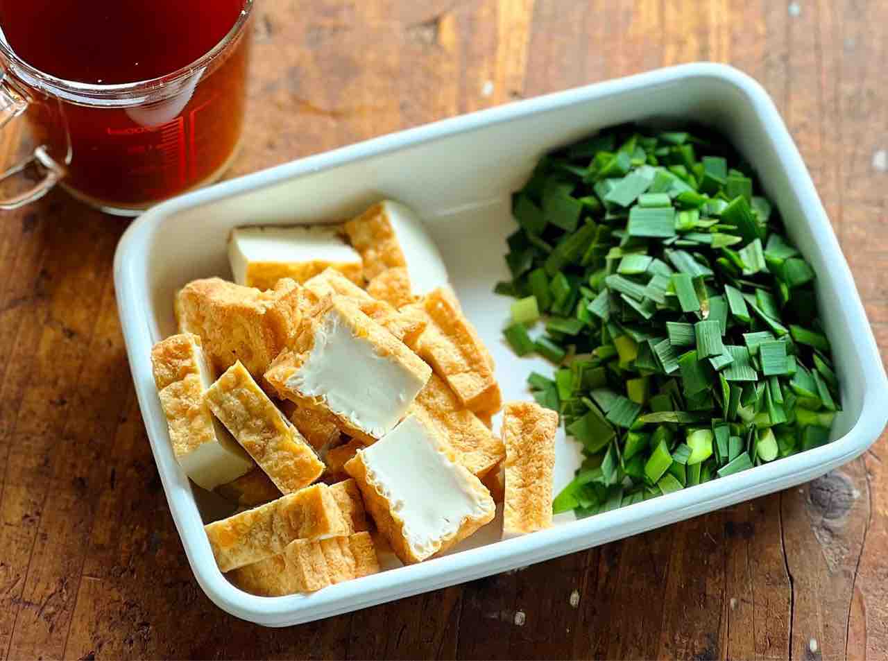 1.厚揚げは一口大に切る。ニラは1cm幅に切る。⚫︎は合わせておく。