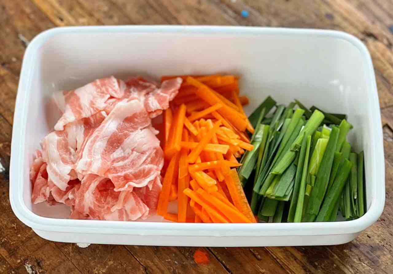 1.豚肉とニラは3cm長さに切る。人参は細切りにする。