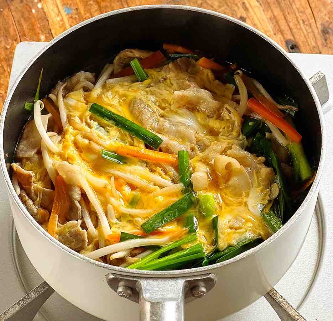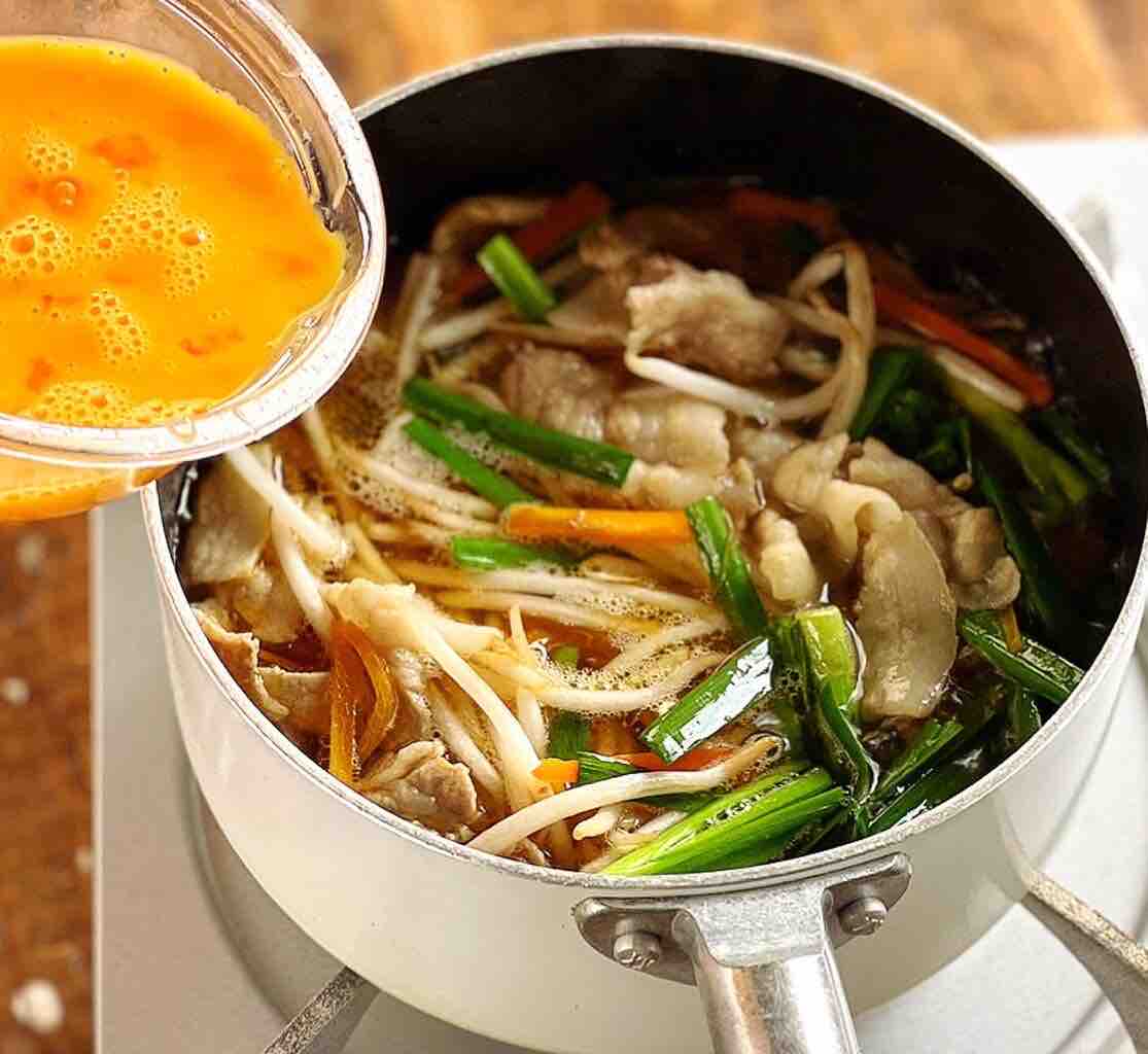 3.ニラともやしを加え、再び煮立ったら溶き卵をまわし入れ、ふんわりしたら火を止める。