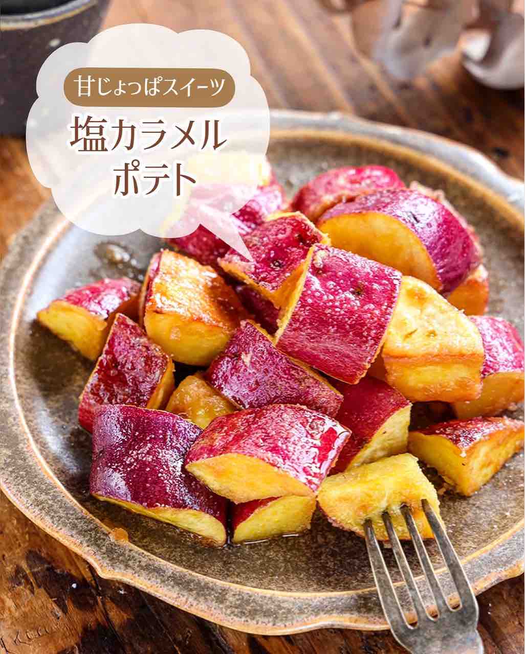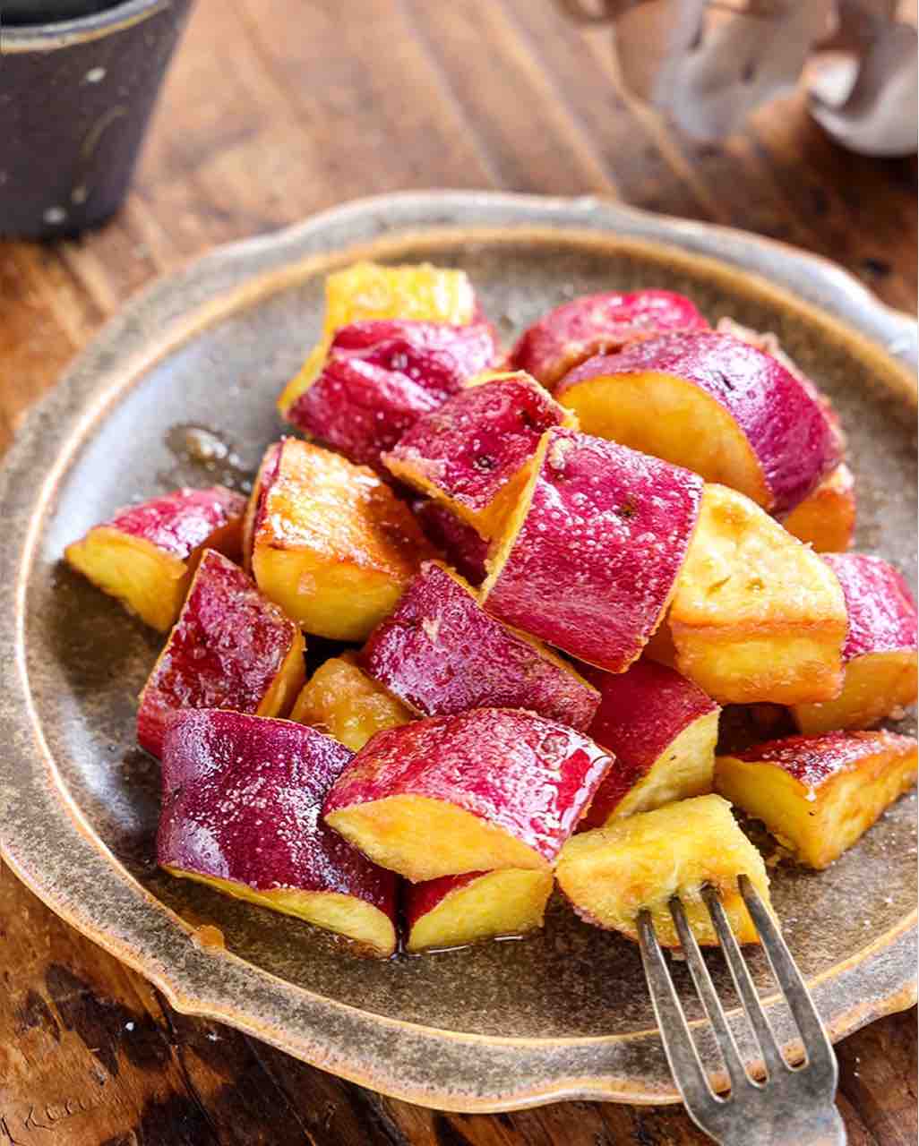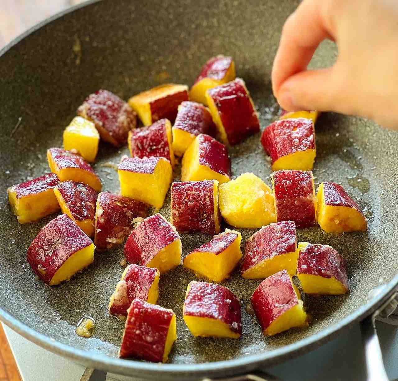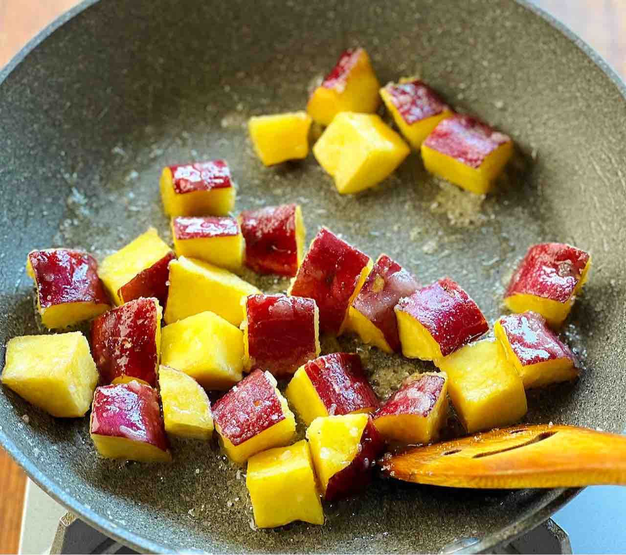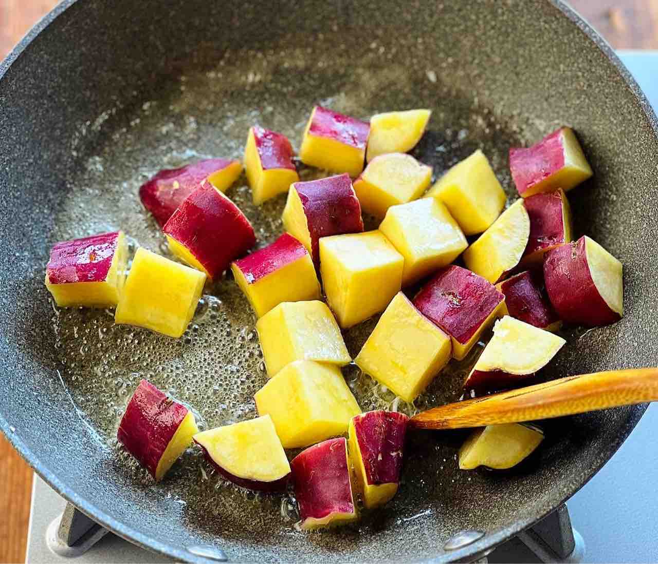 2.フライパンにバターを中火で熱して1を炒める。バターがからんだら砂糖を加え、さつまいもに薄っすら焼き色が付くまで更に炒める。