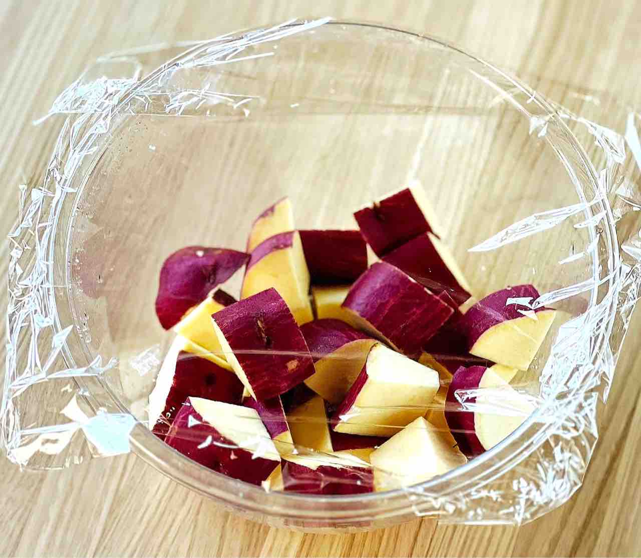 1.さつまいもは皮ごと3cm大に切り、水に5分晒して水気を切る。耐熱ボウルに入れてふんわりラップをかけ、600Wのレンジで4分加熱する。