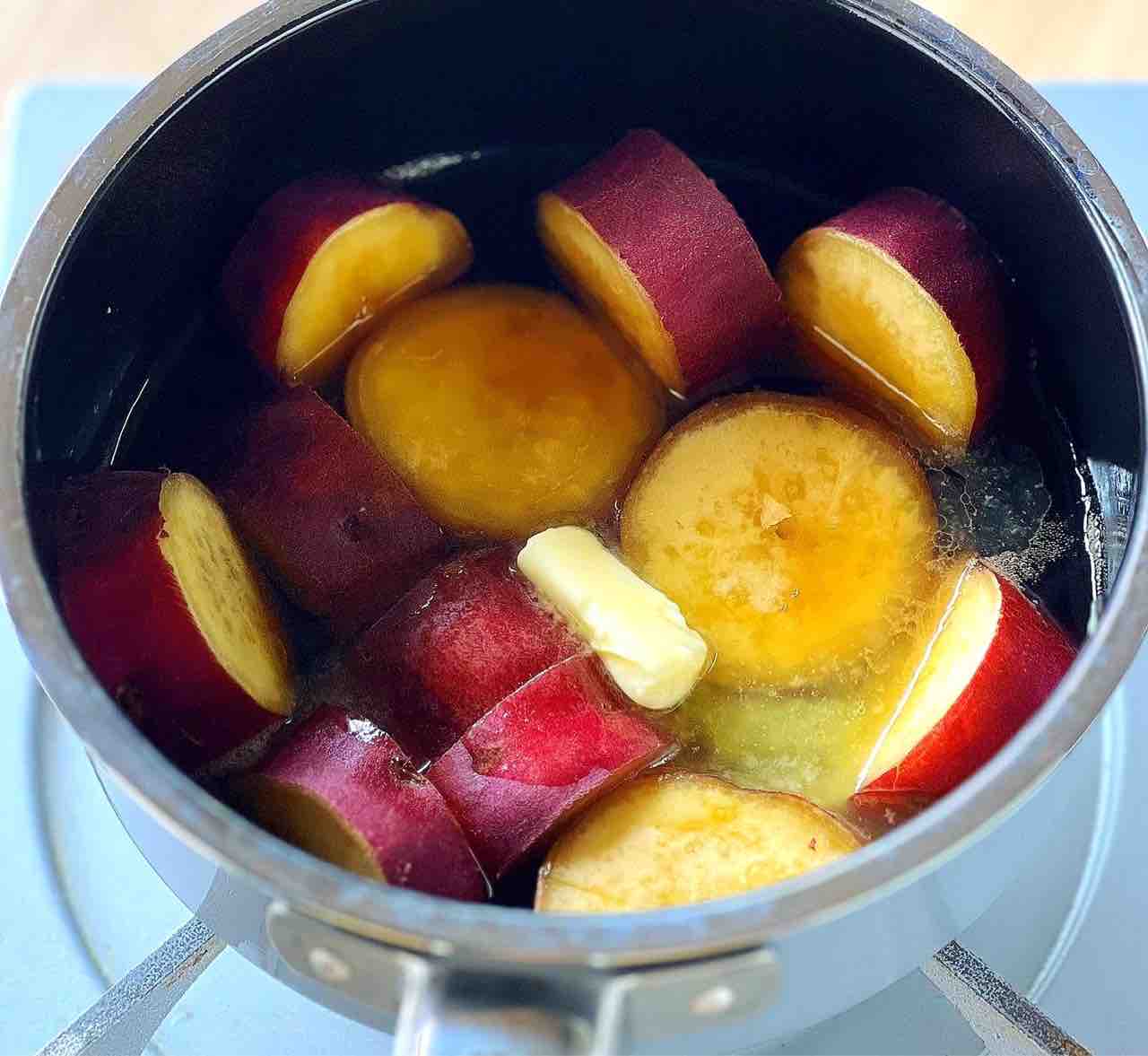 1.さつまいもは2cm幅の輪切り(大きければ半月切り)にし、水に5分晒して水気を切る。