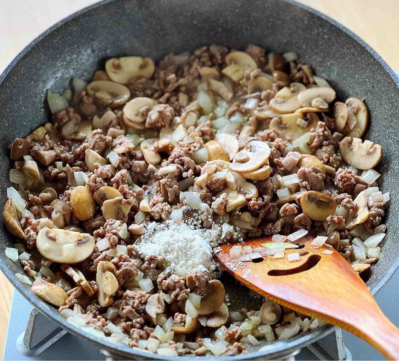 2.フライパンにオリーブ油を中火で熱し、ひき肉と1を炒める。火が通ったら薄力粉を加え、更に1分炒める。