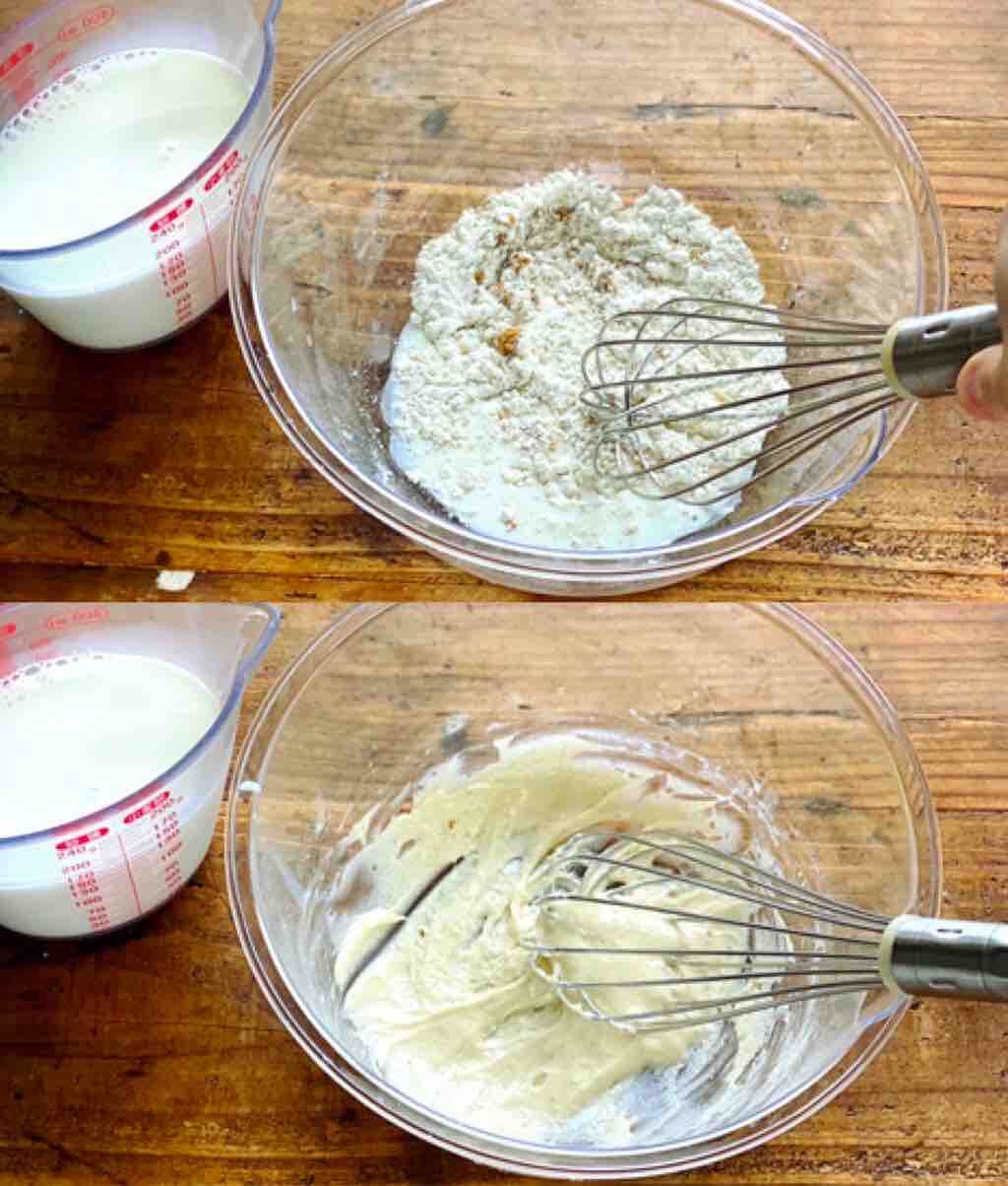 2.大きめの耐熱ボウルに●を入れ、牛乳を''少しずつ注いで''都度よく混ぜる。