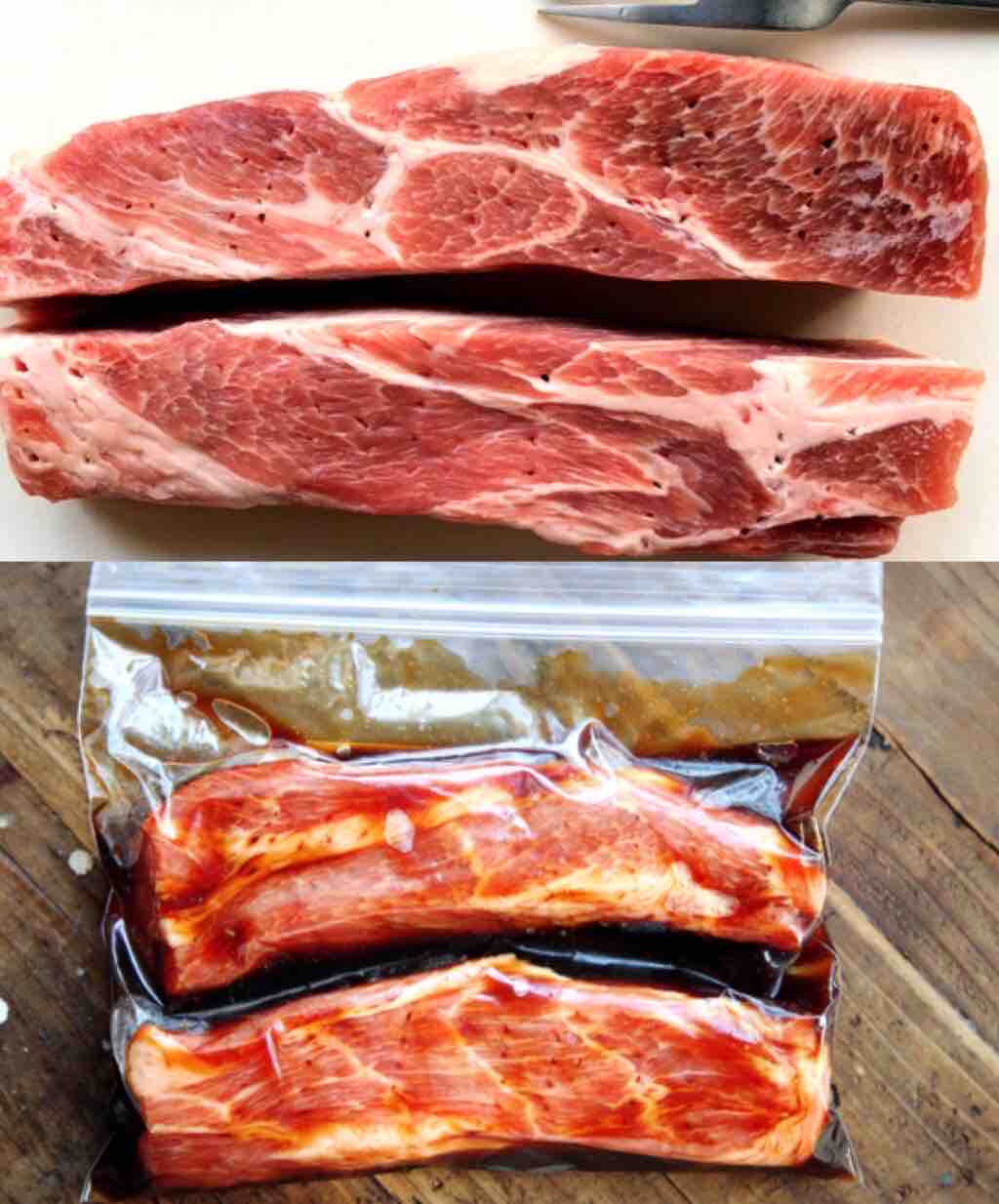 1.豚肉は縦半分に切り、全体をフォークで刺す。ポリ袋に●と豚肉を入れてよく揉み込み、冷蔵庫で一晩漬ける。