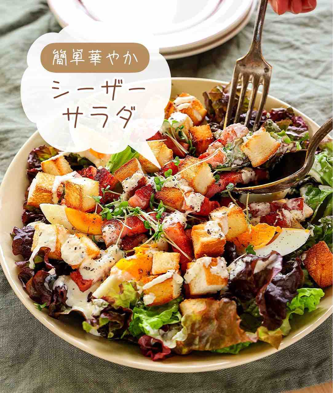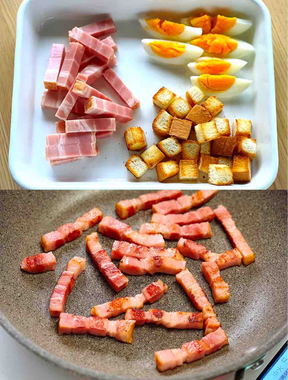 1.ベーコンは1cm角の棒状に切り、フライパンで全体に焼き色が付くまで焼く。ゆで卵は4〜6等分のくし形に切る。食パンは1.5cm角に切り、トースターで焼き色が付くまで焼く。