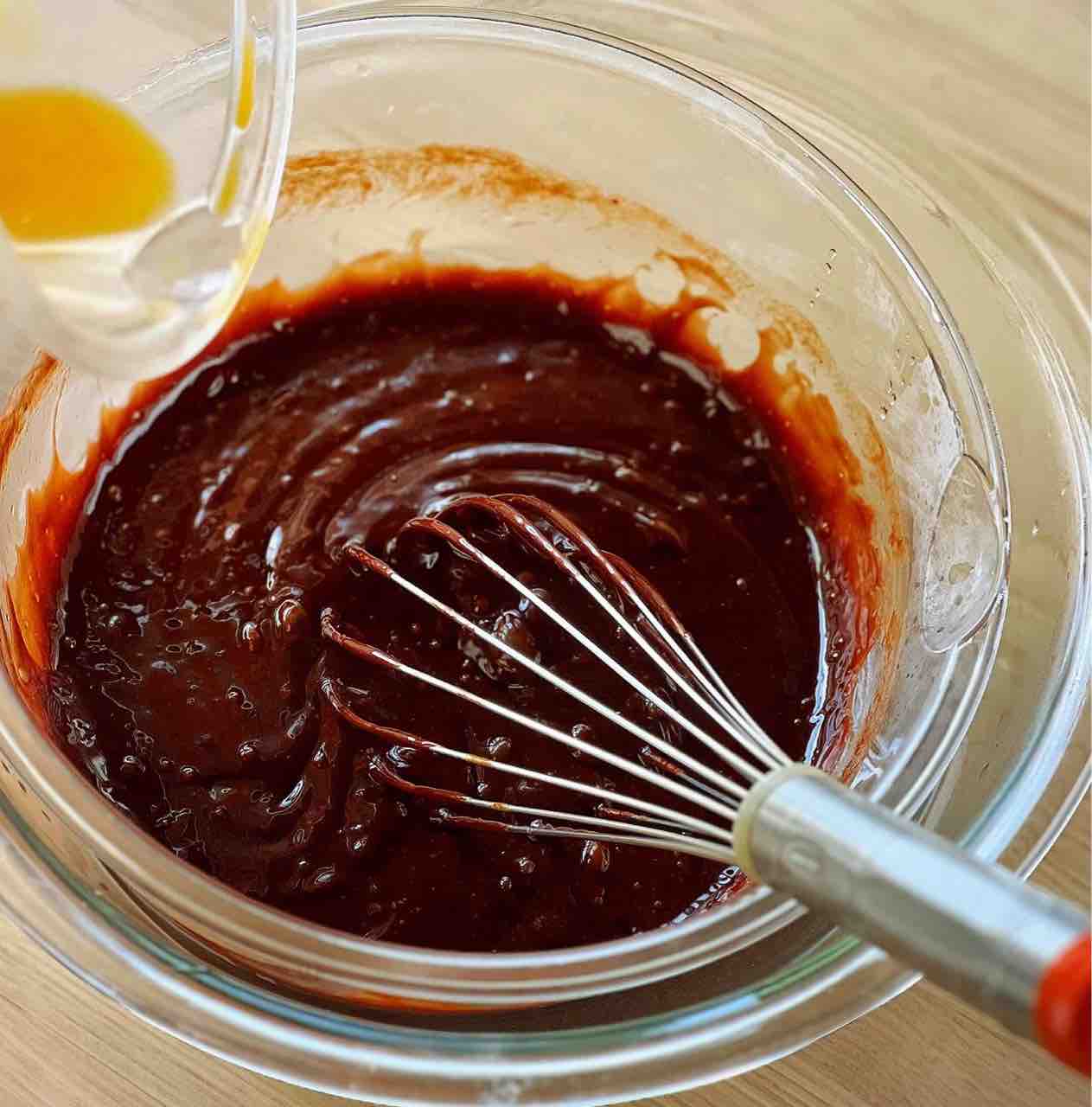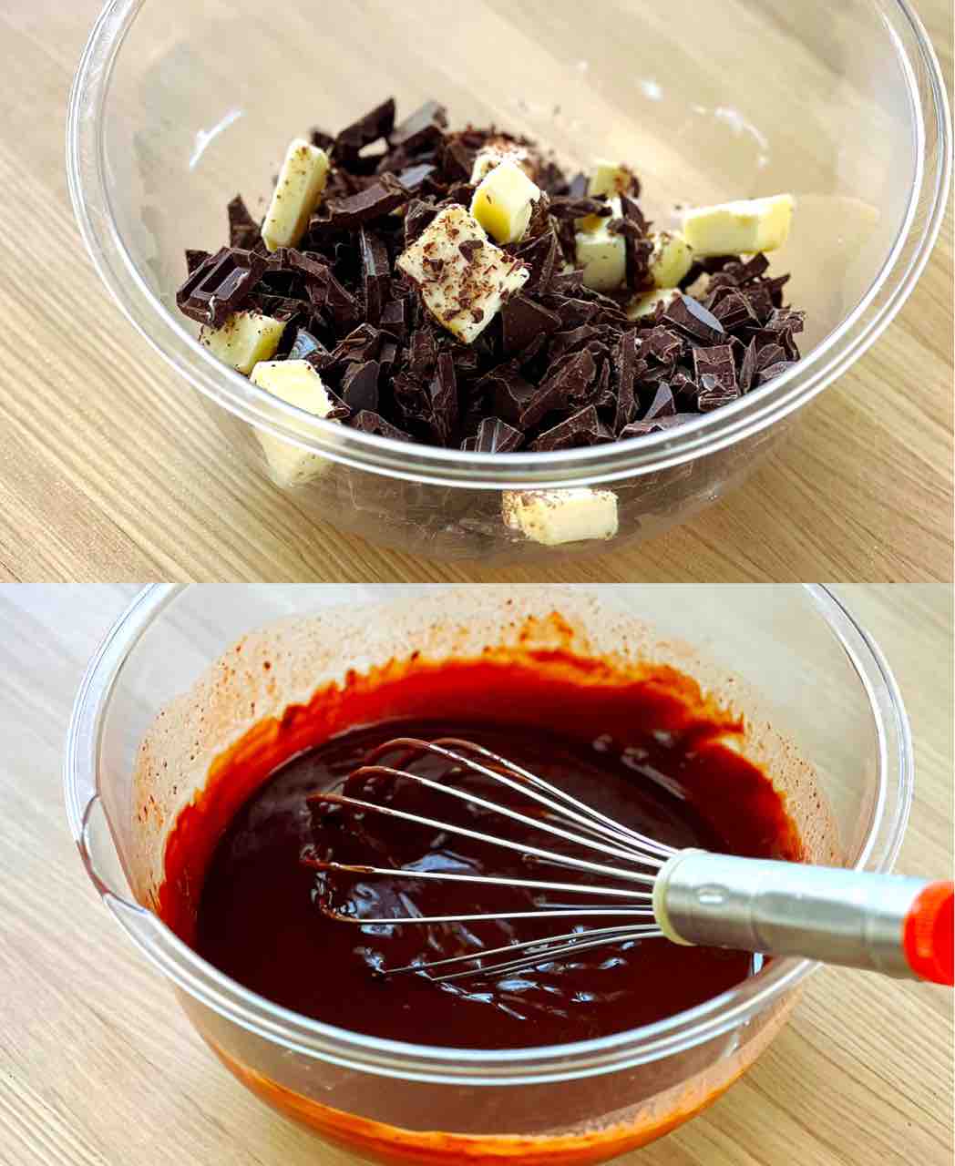 1.耐熱ボウルにチョコとバターを入れ、600Wのレンジで2分加熱し、混ぜて溶かす。