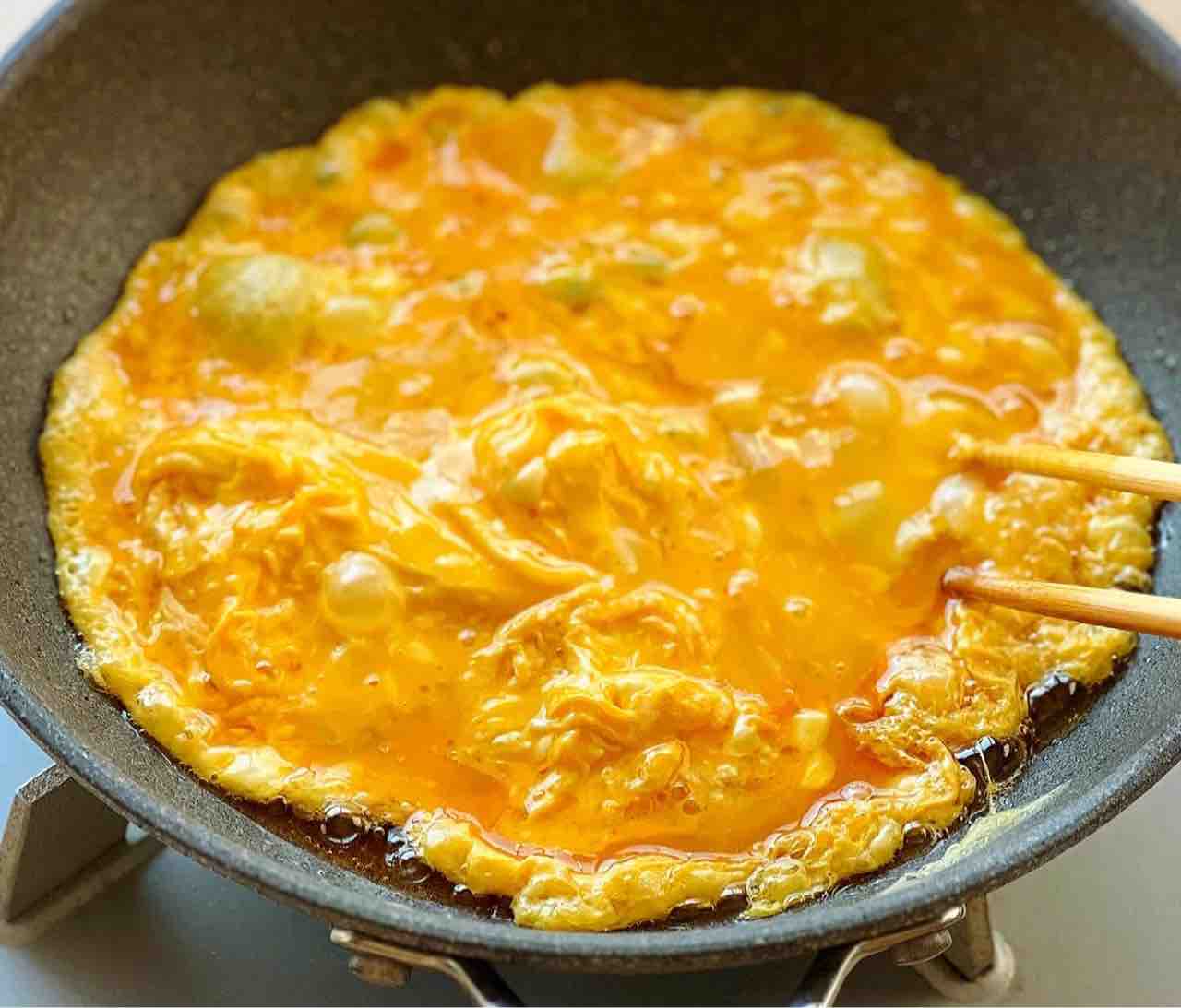 2.フライパンにごま油を強火で熱し、卵液を流し入れ、半熟状に炒めて取り出す。