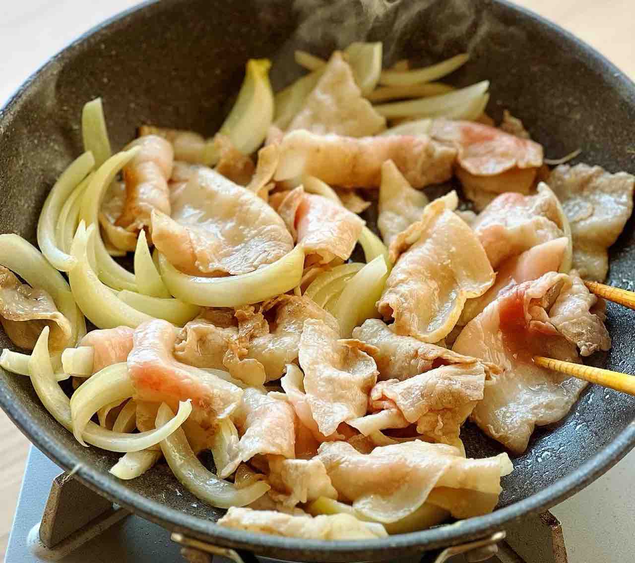 3.そのままのフライパンを中火で熱し、豚肉と玉ねぎを炒める。火が通ったらキムチ、ニラ、焼肉のたれを加えてさっと炒め、2を戻し入れてざっくり混ぜる。