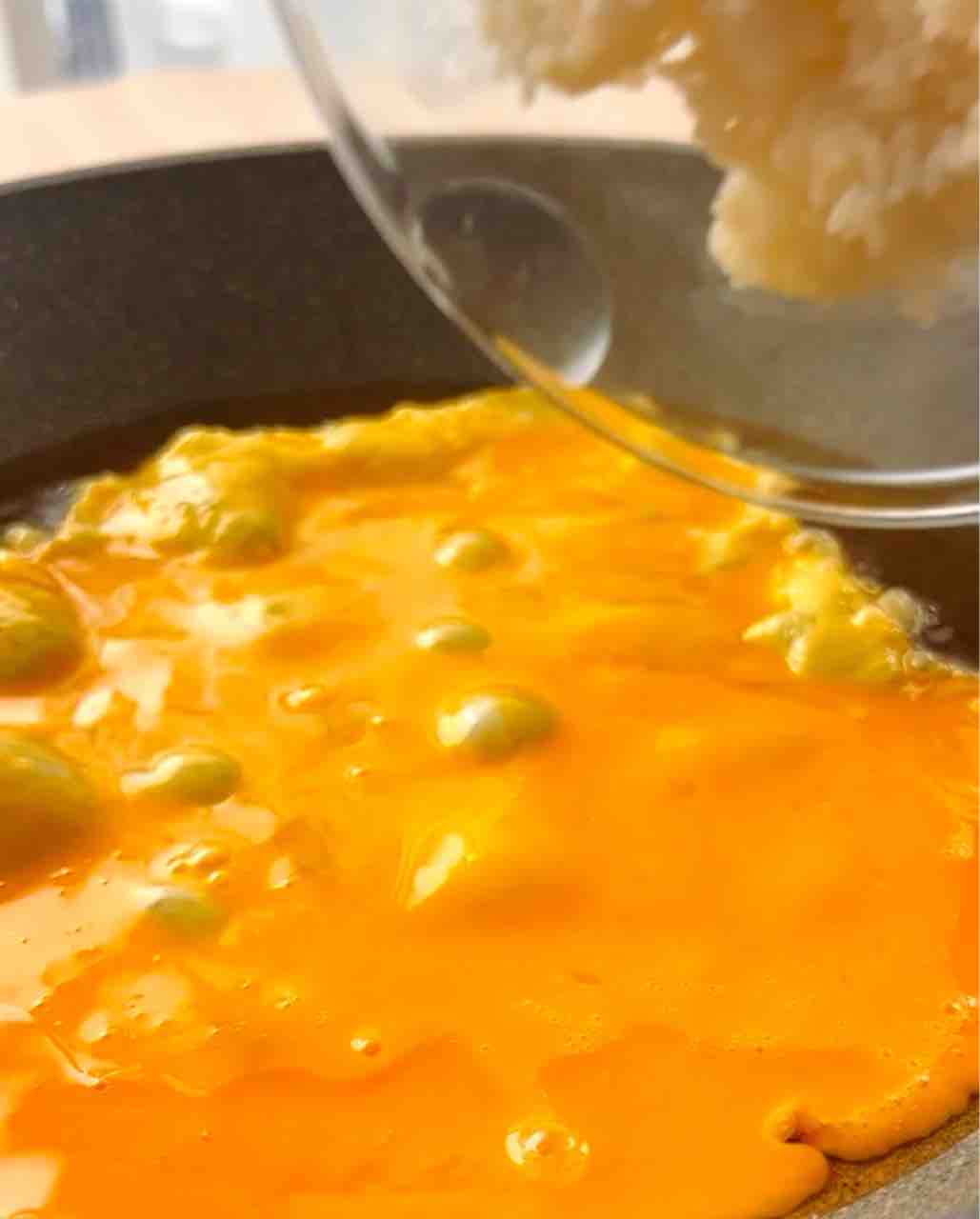 溶き卵の後すぐにごはんを加える