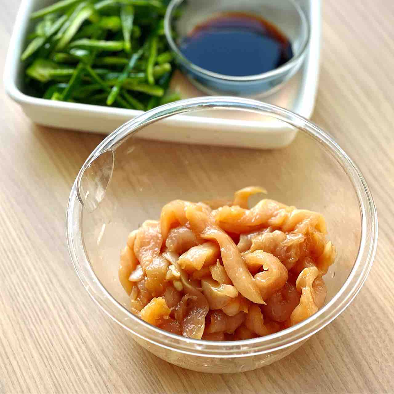 1.鶏肉は細切りにし、⚫︎を揉み込む。ピーマンは細切りにする。☆は合わせておく。