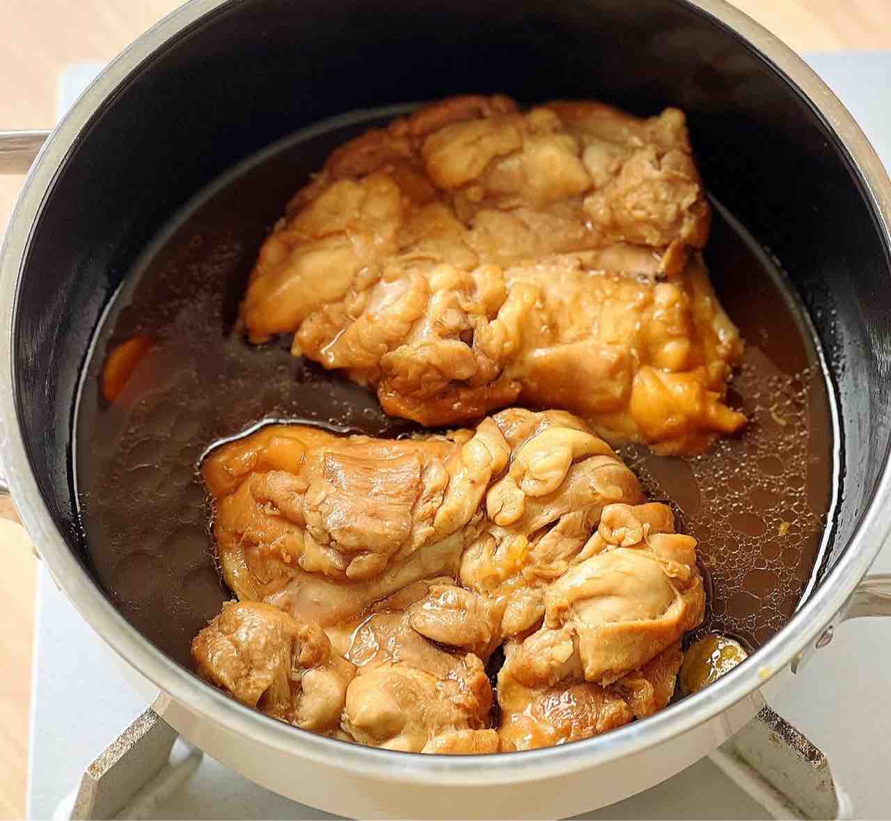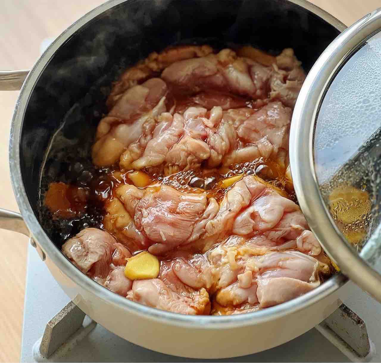 1.直径20cmの鍋に●を入れ、鶏肉を皮を下にして入れ、生姜も加えて中火にかける。煮立ったら蓋をし、弱めの中火で18分煮る。