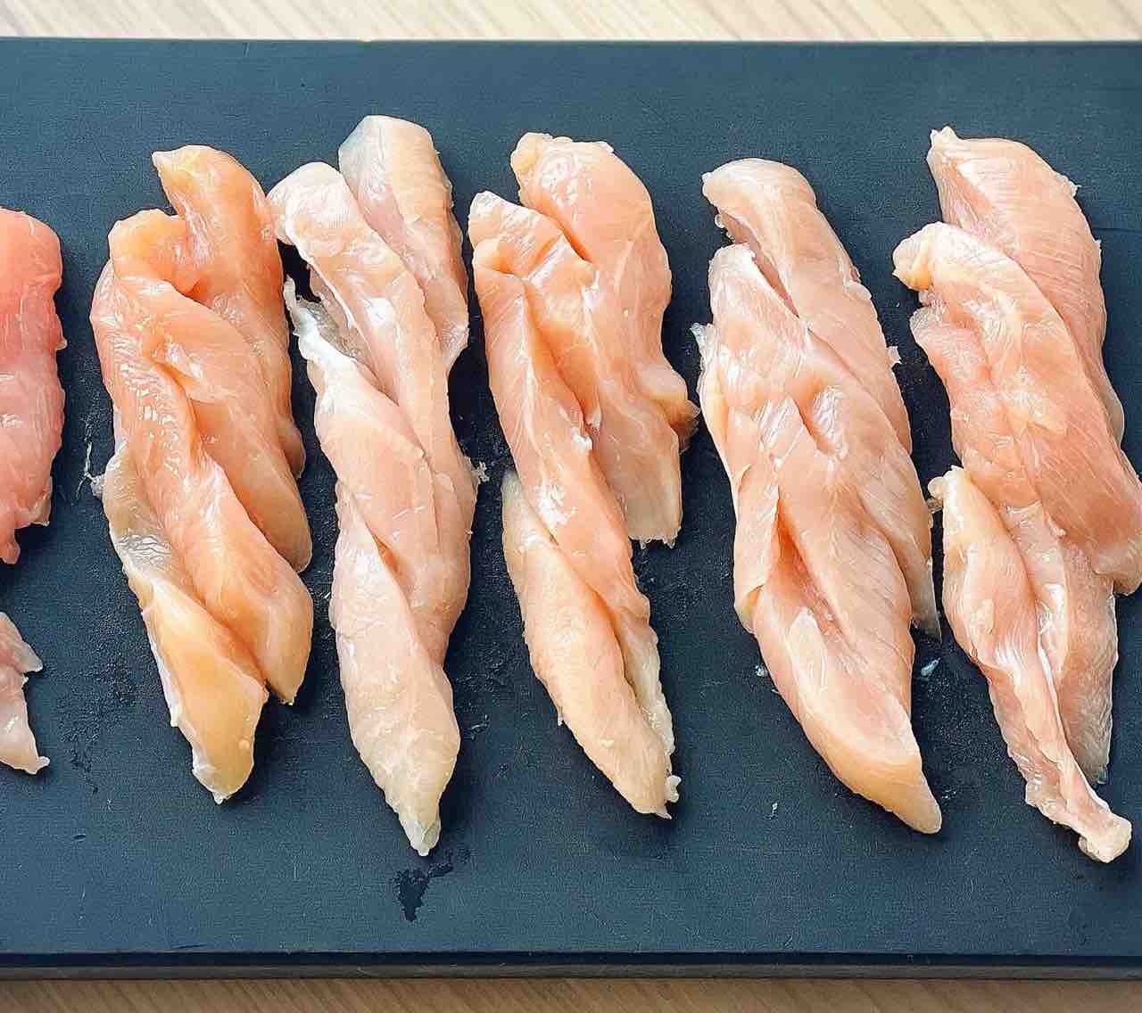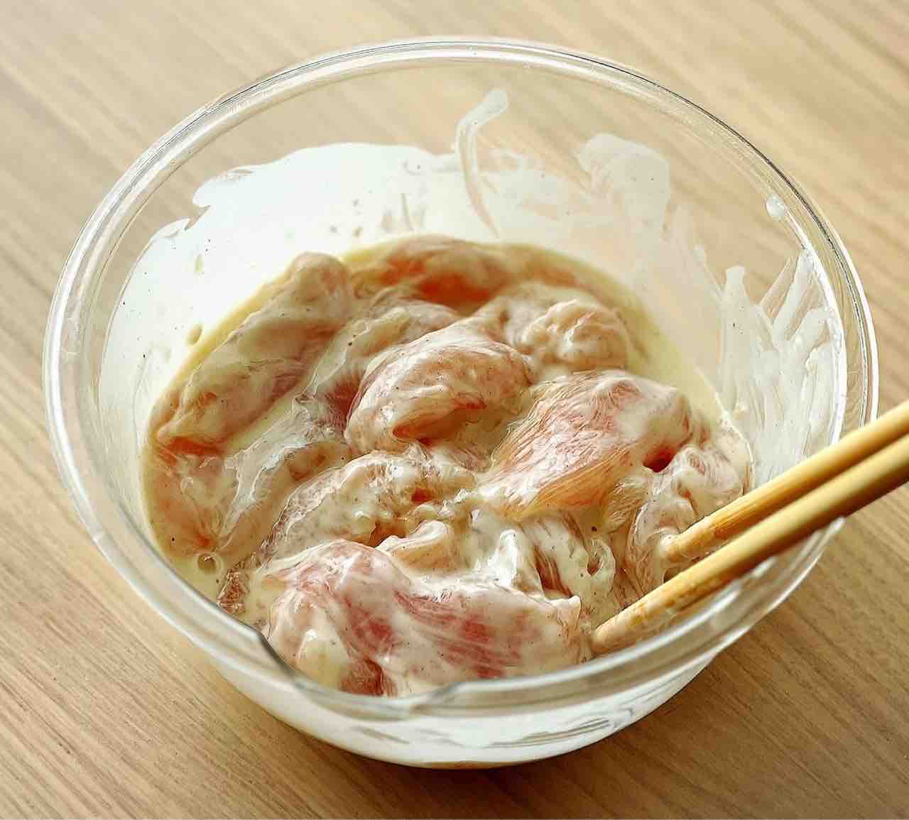 1.ささみは(気になる方は筋を取って)斜め4等分に切る。