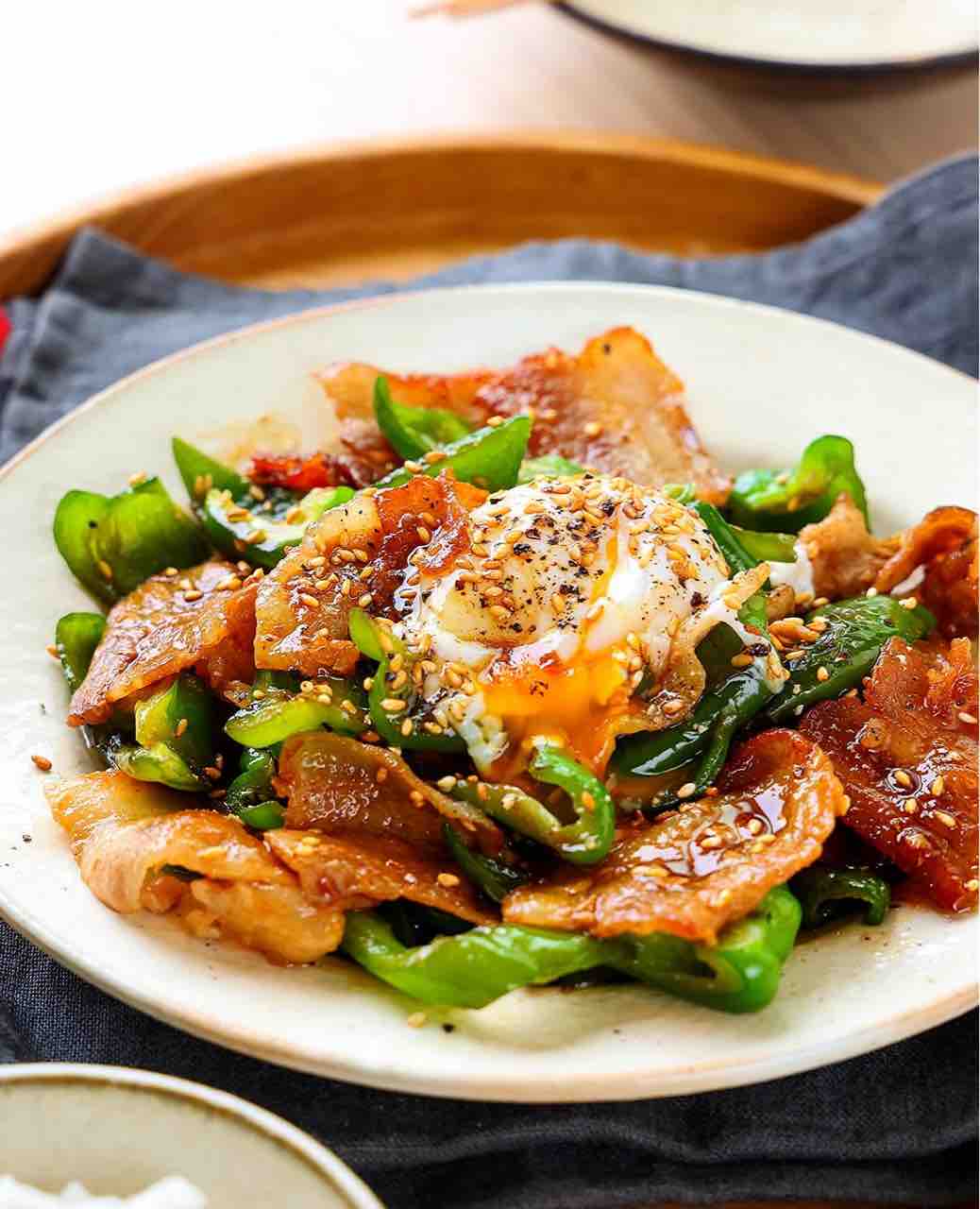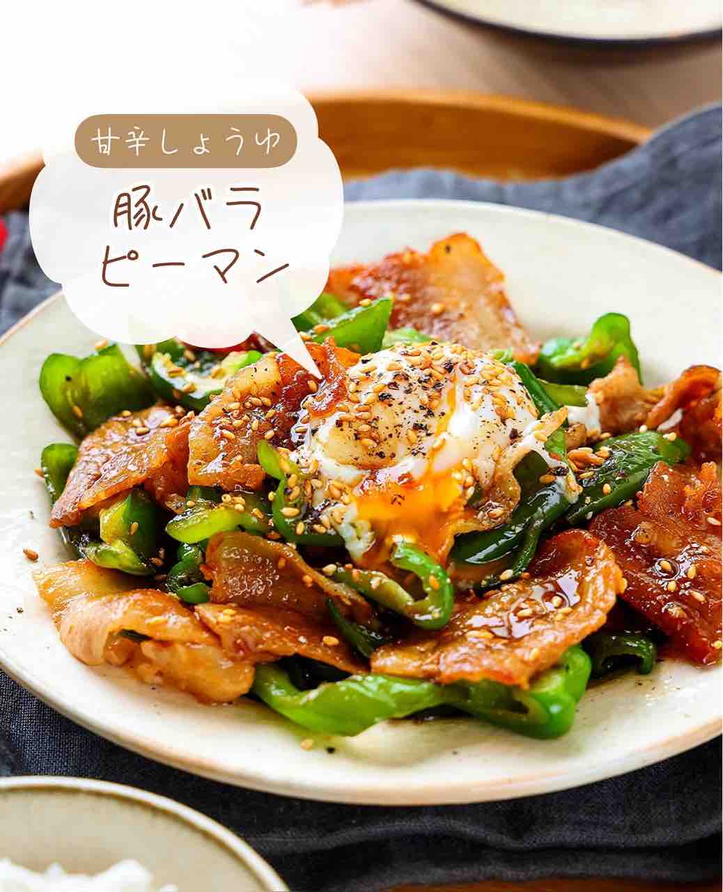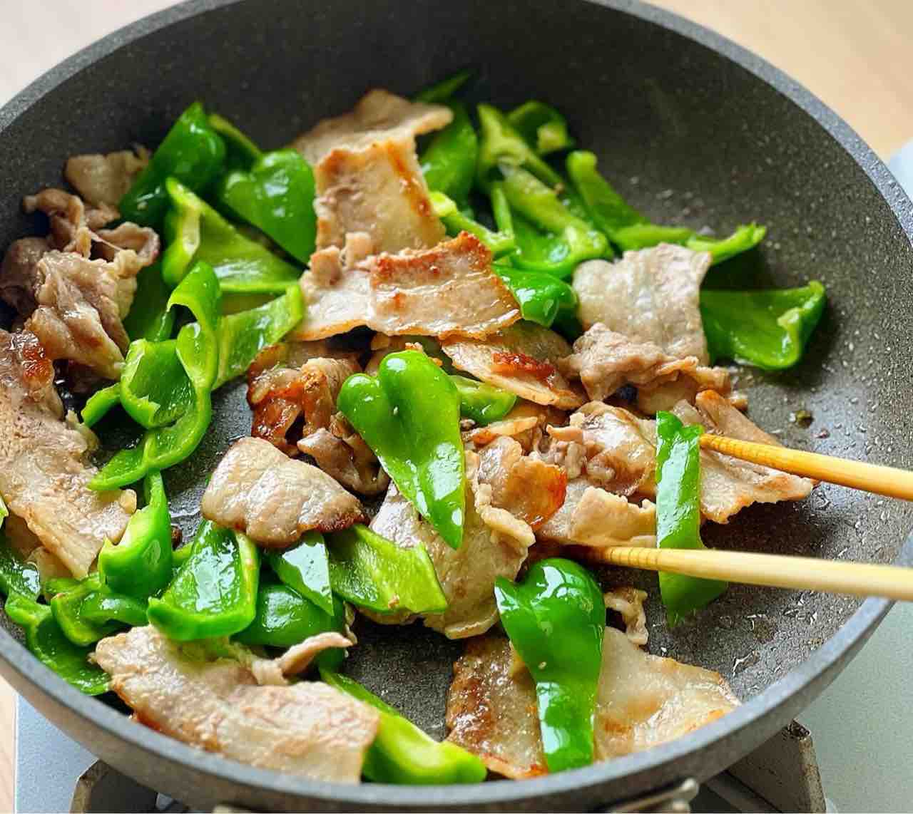 2.フライパンにごま油を中火で熱して豚肉を炒める。火が通ったらピーマンも加えて炒め合わせ、⚫︎を加えて煮からめる。