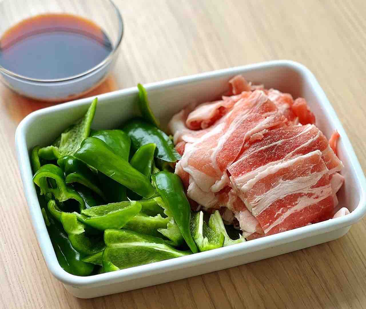 1.豚肉は4cm長さ、ピーマンは一口大に切る。⚫︎は合わせておく。