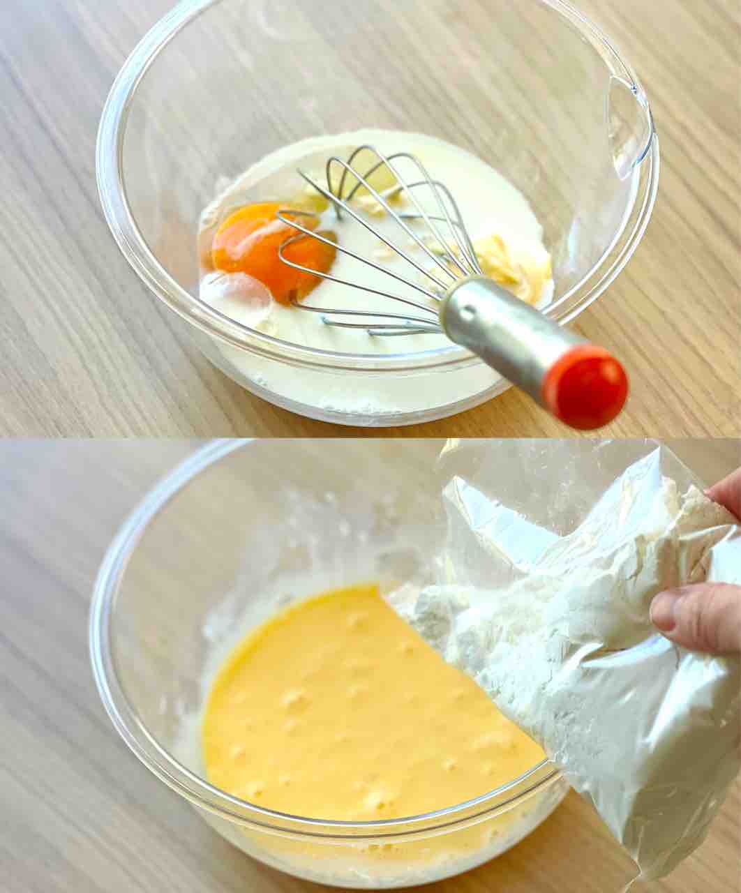 2.別のボウルに⚫︎を入れてよく混ぜ、ホットケーキミックスも加え、粉っぽさがなくなるまで混ぜる。