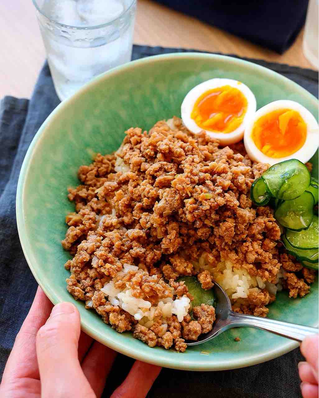 2.器にごはんを盛り、1をかけ、ゆで卵ときゅうりをトッピングする。
