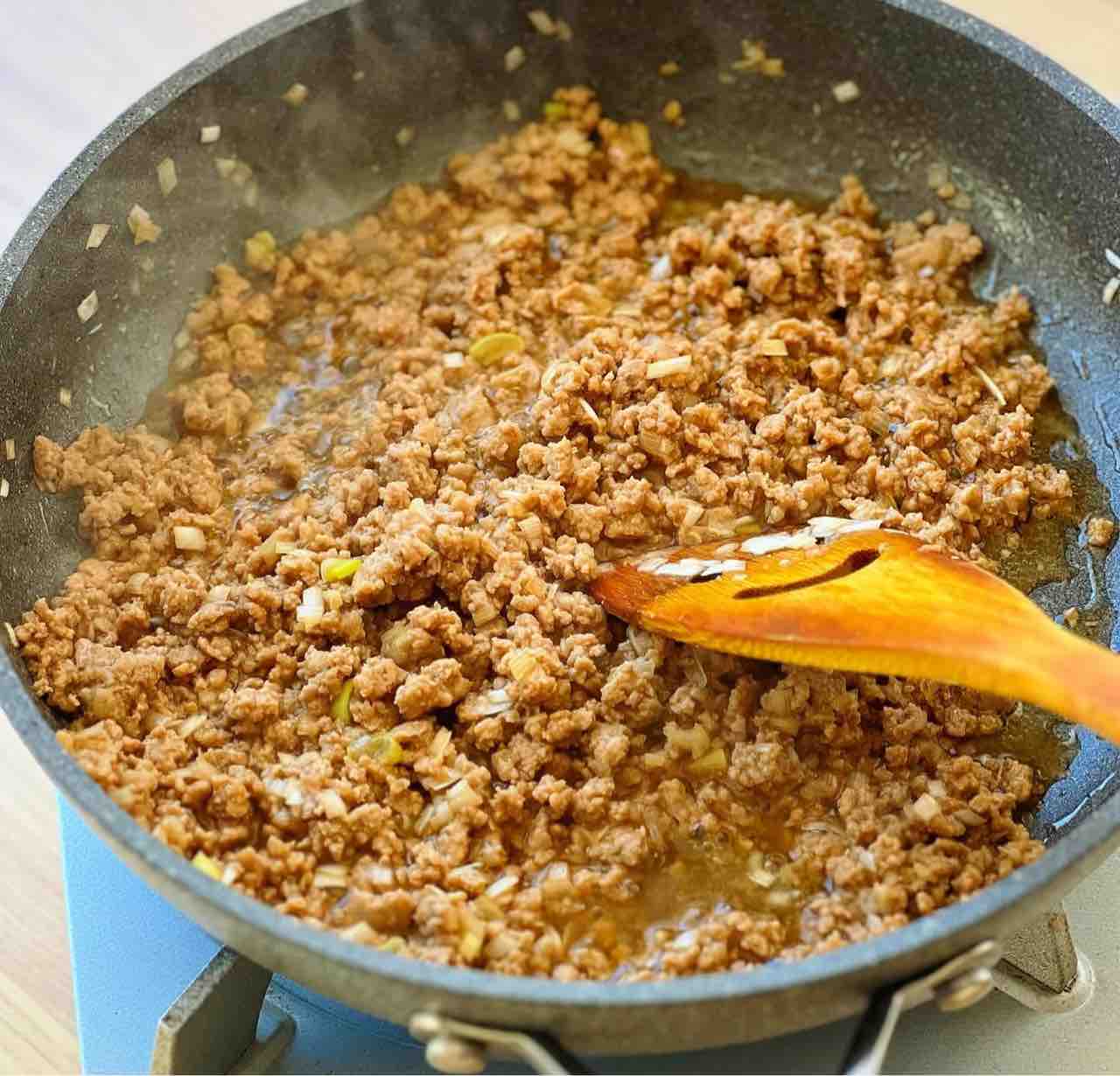 1.フライパンにひき肉、長ねぎ、⚫︎を入れて混ぜる。中火にかけ、水分が少なくなるまで混ぜながら加熱する。