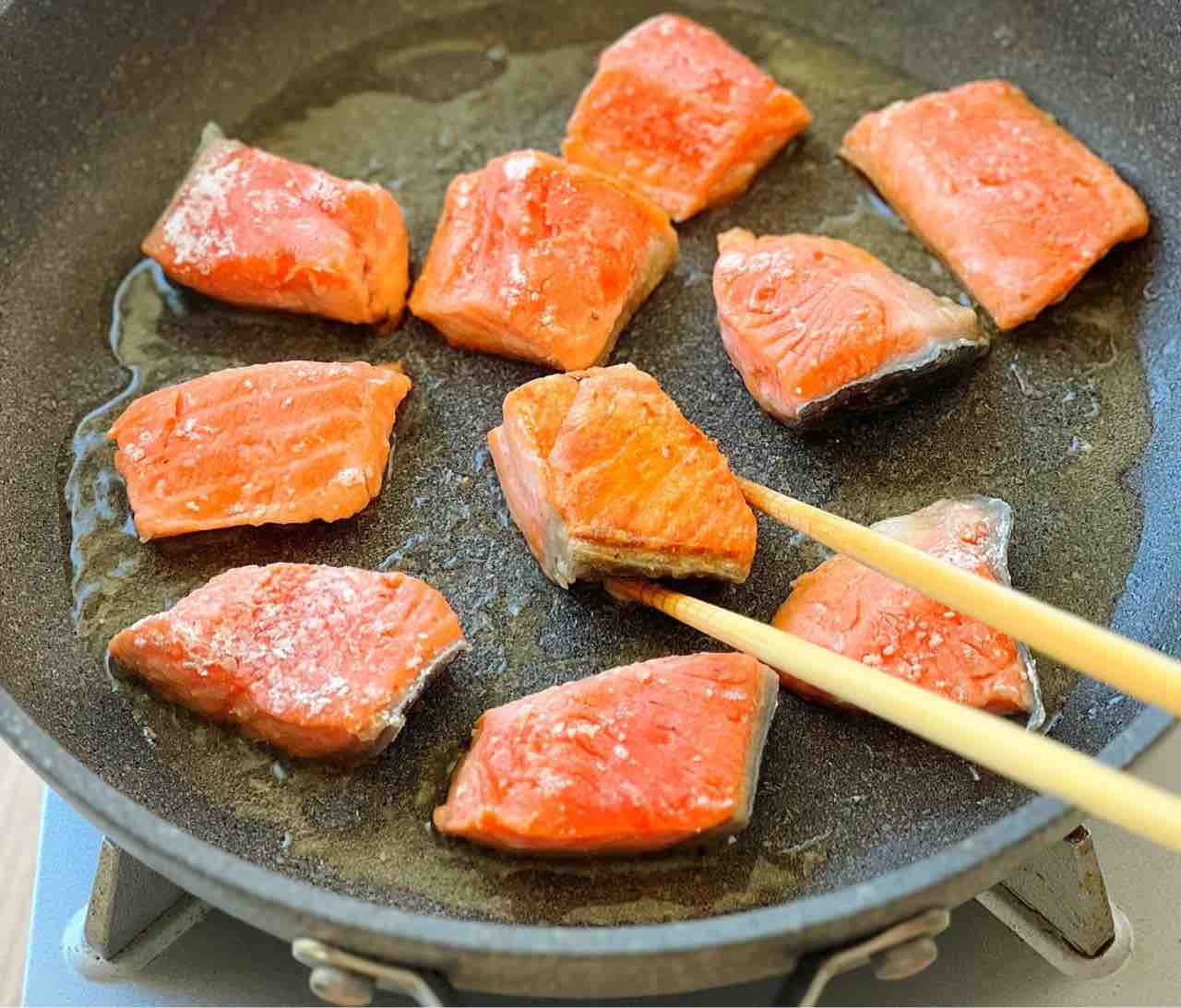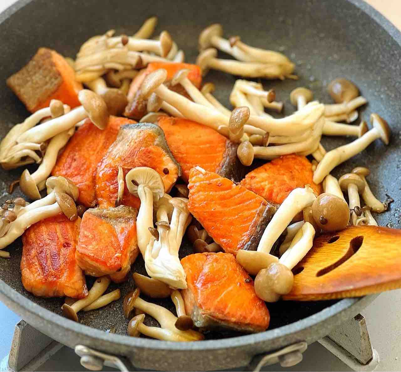 2.フライパンに油を中火で熱し、鮭を両面色よく焼く。ほとんど火が通ったらしめじを加えて炒め合わせる。