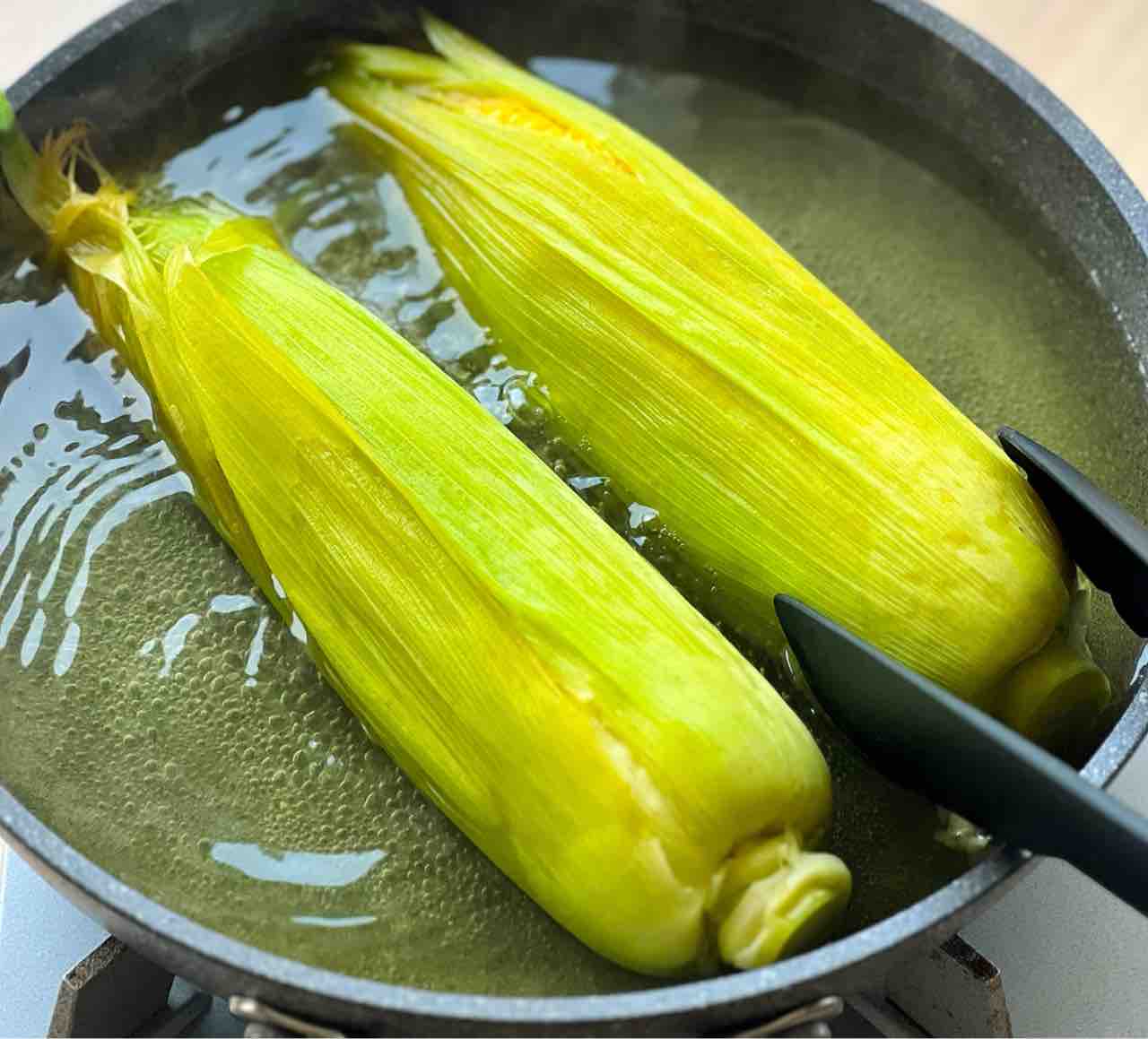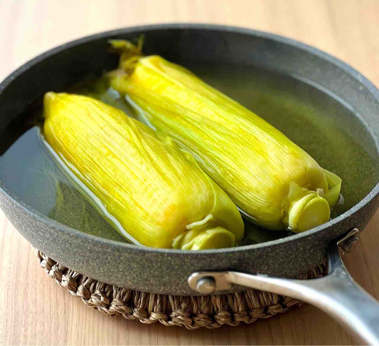 2.フライパンに水を入れて火にかけ、沸騰したら塩を加える。とうもろこしを入れ、ふつふつするくらいの火加減で10分茹でる(たまに転がす)。