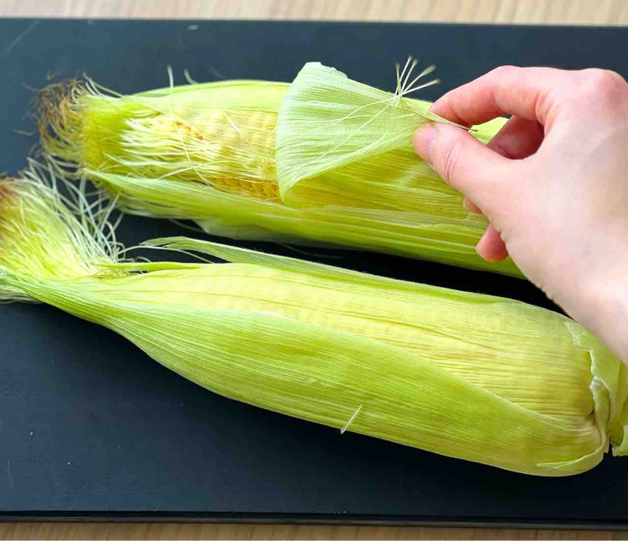 1.とうもろこしは薄皮を1〜2枚残して皮を剥く。
