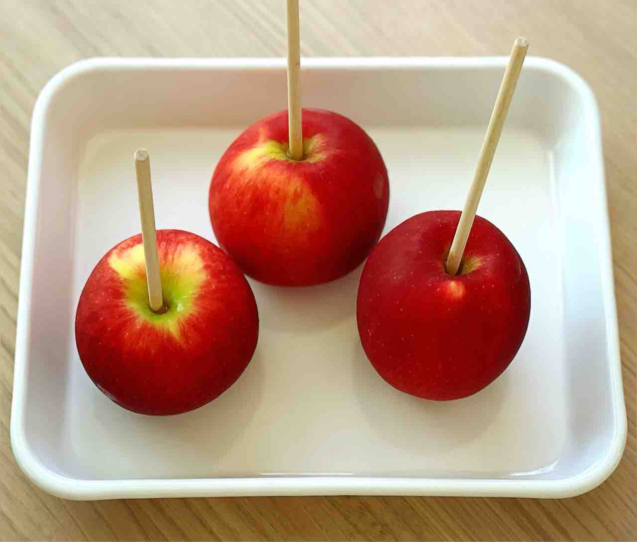 1.JAZZ™︎りんごのヘタを取り、皮ごと洗ってしっかり水気を拭く。ヘタ側から割り箸(などの木製のスティック)を刺し込む。