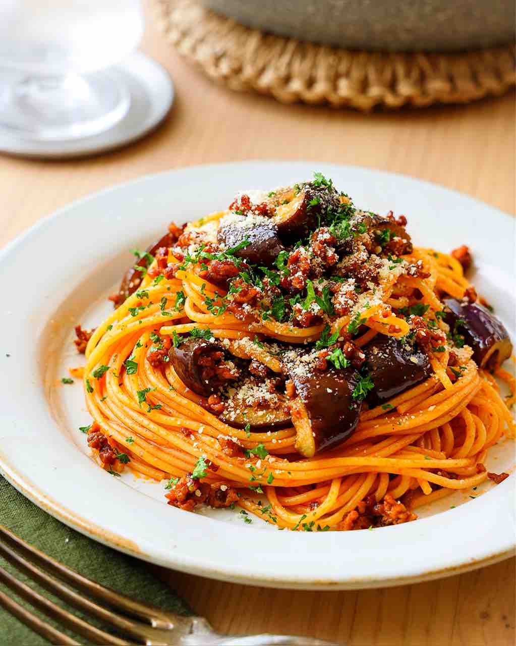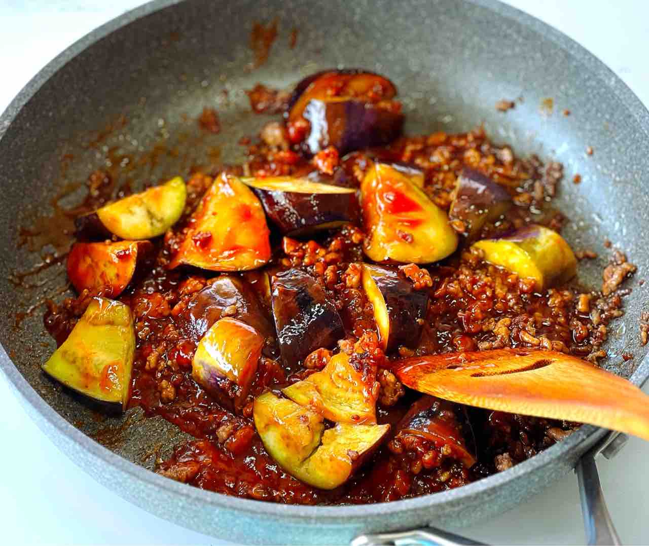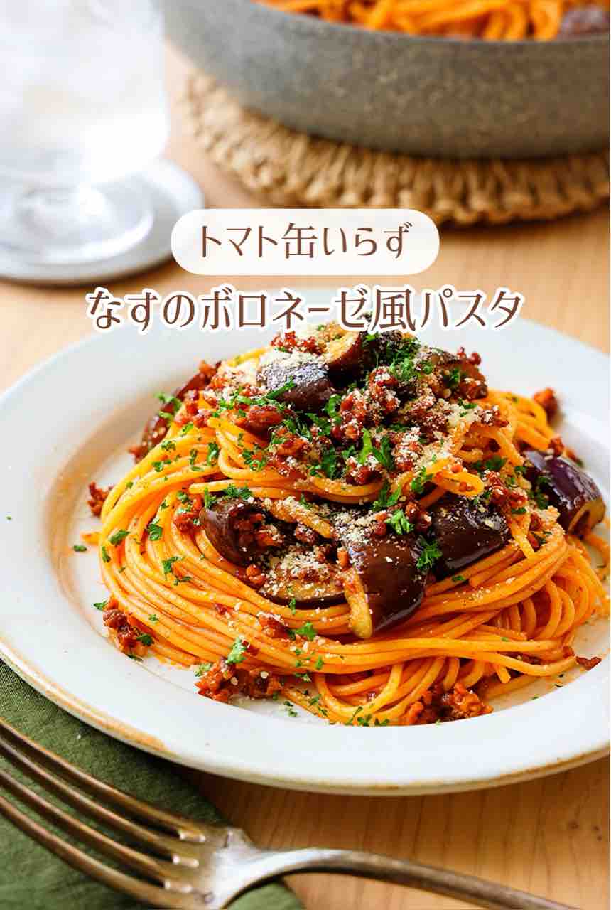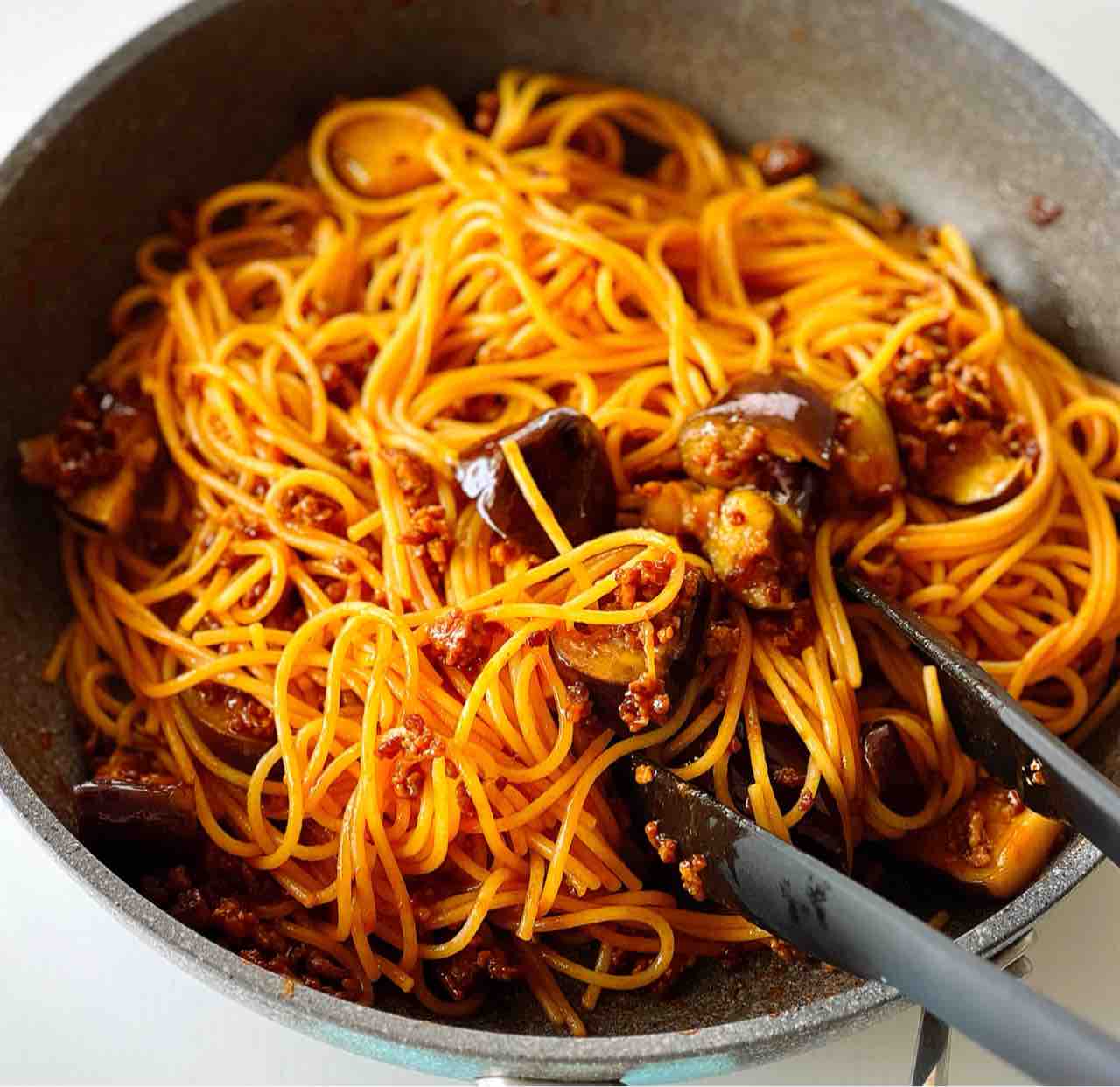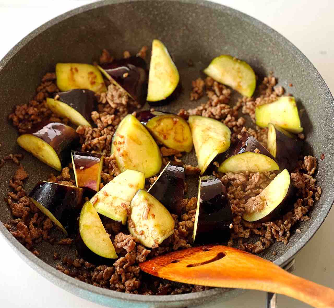 2.フライパンにオリーブ油を中火で熱してひき肉を炒める。火が通ったらなすも加えて更に炒め、しんなりしたら●を加えて煮からめる。