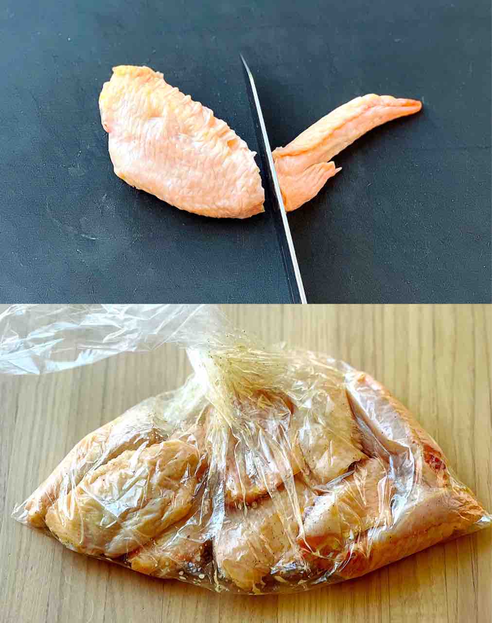 1.手羽先の先端を関節で切り落とし、ポリ袋に入れて⚫︎を揉み込む。
