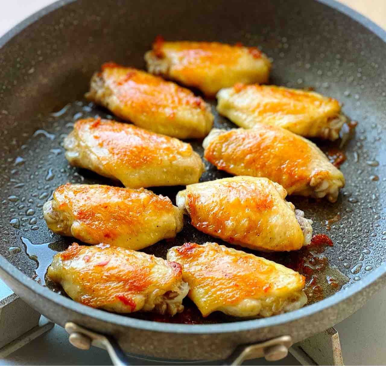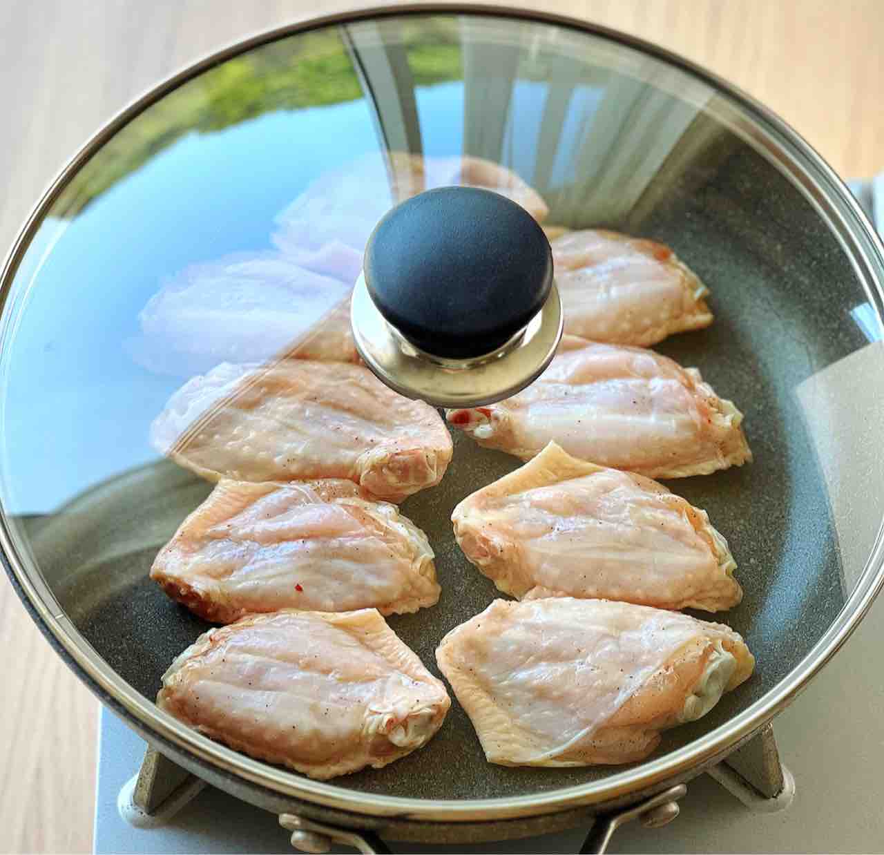 ♦︎手羽先の先端を切り落とすとフライパンに収まりやすくなります♩