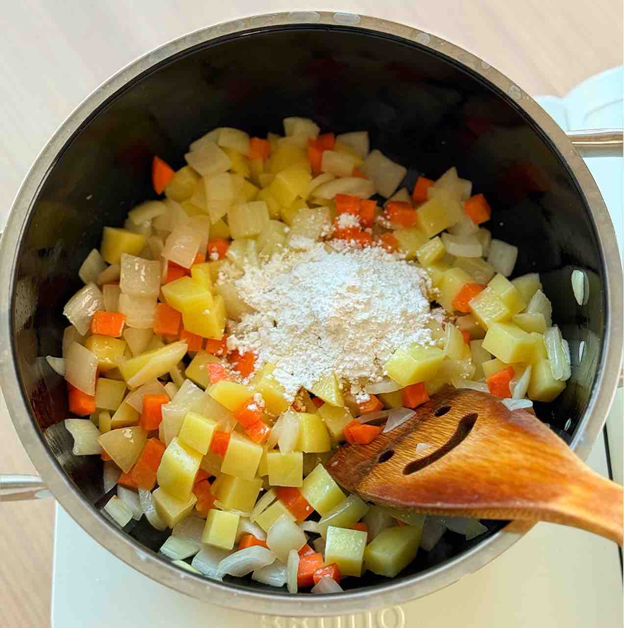 2.鍋にバターを中火で熱して1の野菜を炒める。玉ねぎがしんなりしたら薄力粉を加えて1分炒める。
