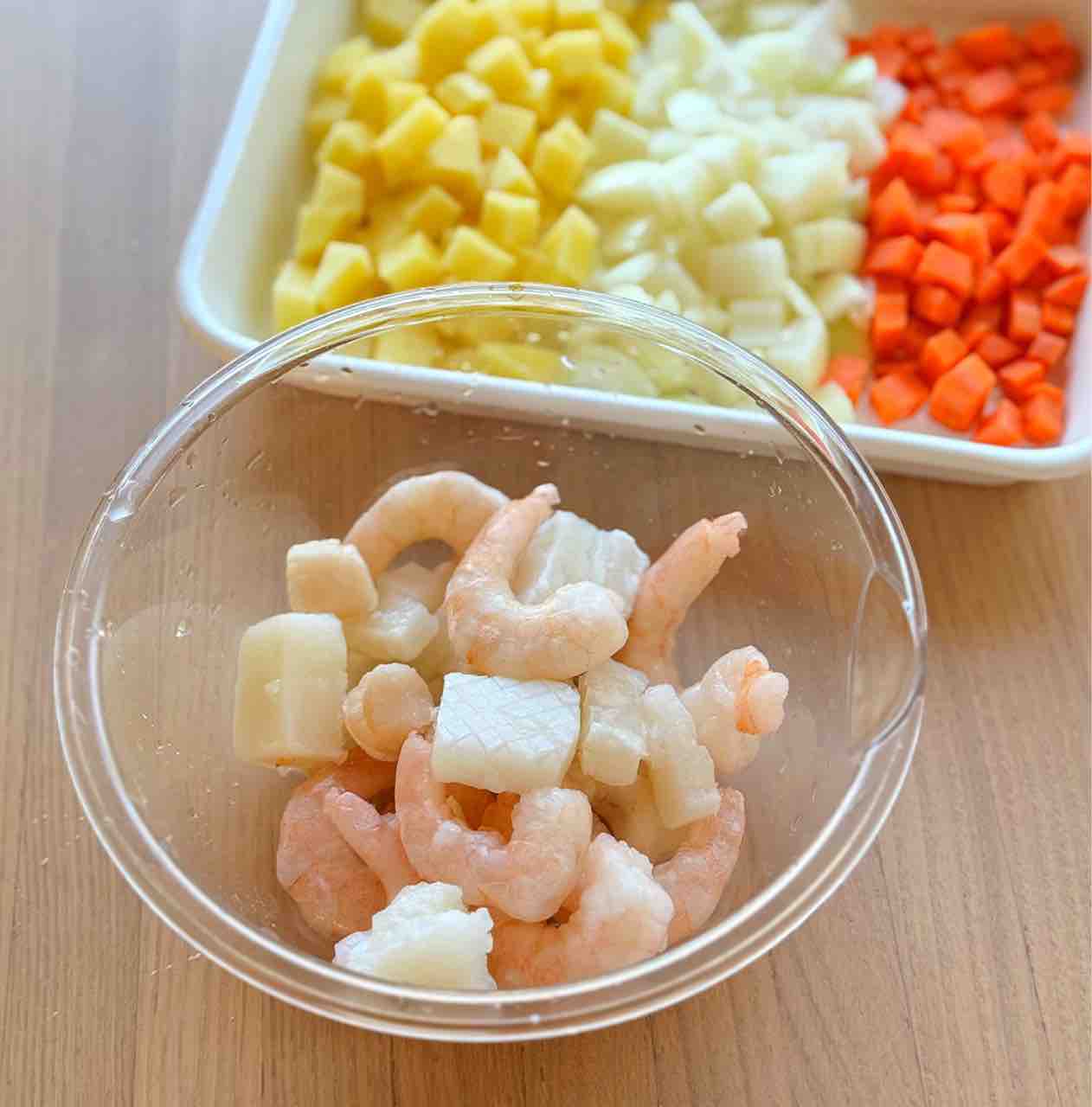1.シーフードミックスは流水に当てて半解凍し、水気を切る。じゃがいもと玉ねぎは1cm角、人参は5mm角に切る。