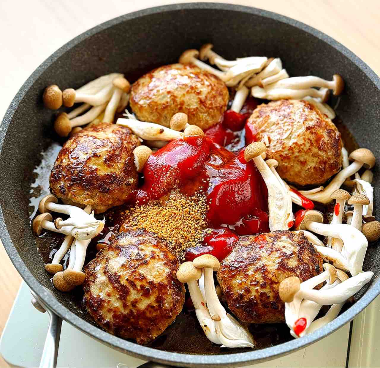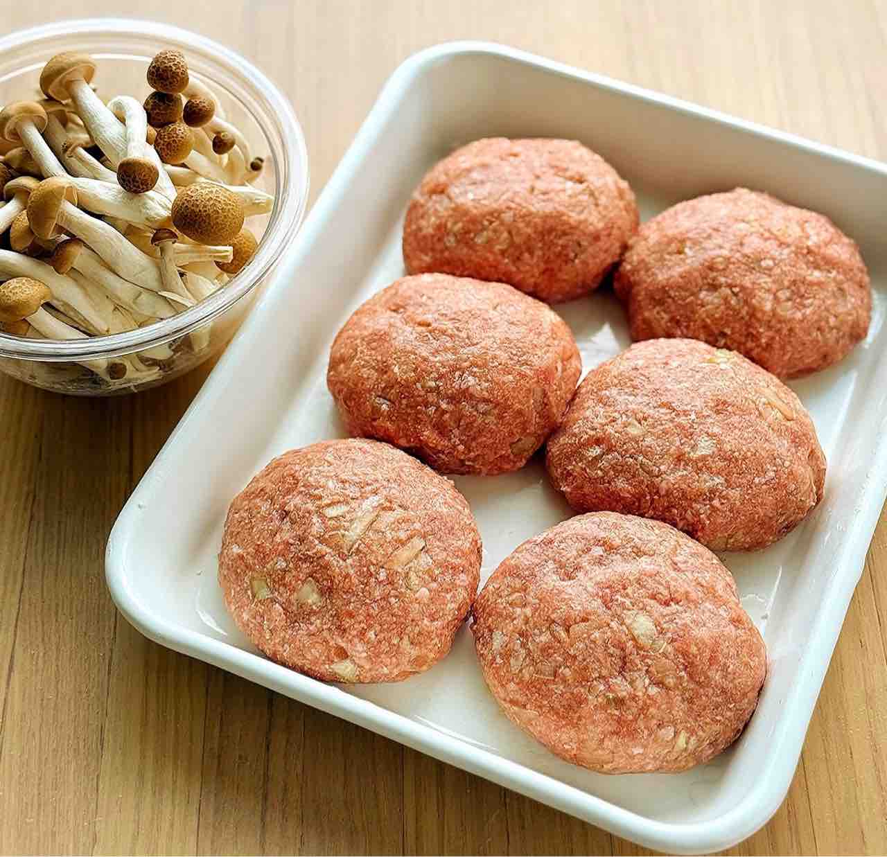 1.ボウルに⚫︎を入れてよく混ぜ、6等分の小判形にする。しめじはほぐす。