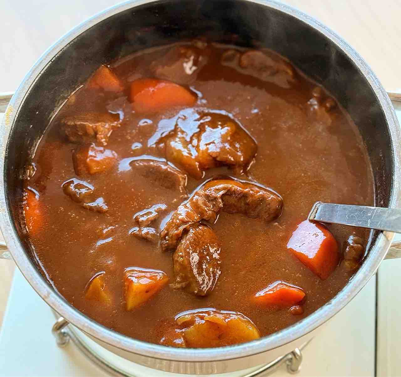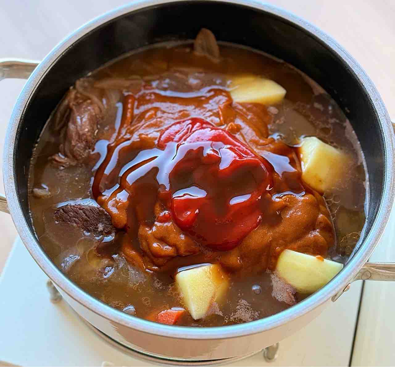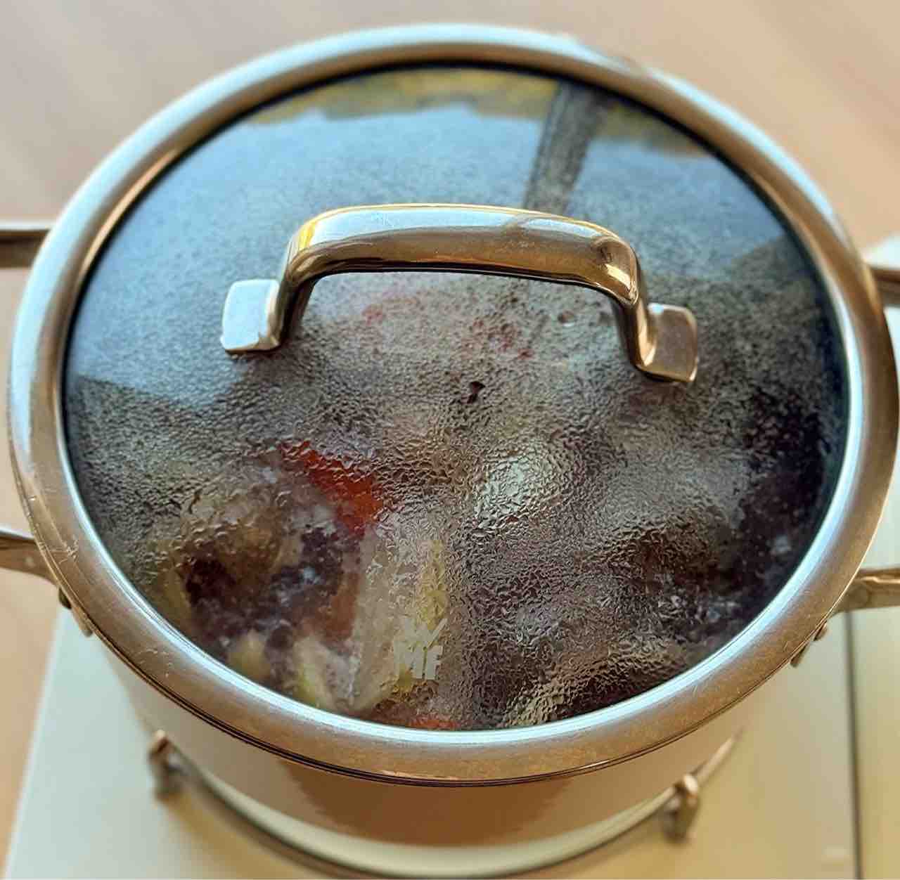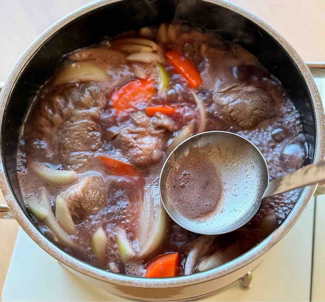 3.●を加え、煮立ったらアクを除き、蓋をして弱火で90分煮込む。