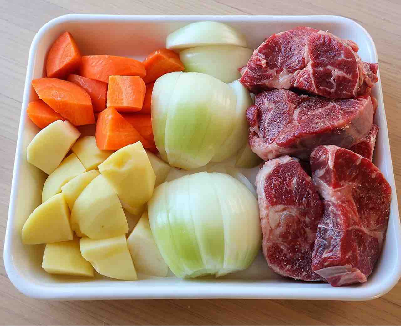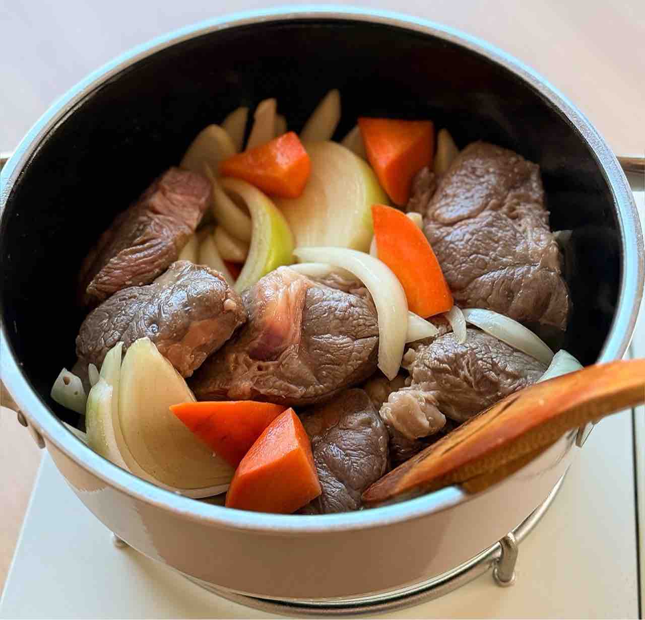 1.牛肉は全体をフォークで刺し、塩、こしょうをすり込む。玉ねぎは1.5cm幅のくし形に切り、人参とじゃがいもは3cm大の乱切りにする。