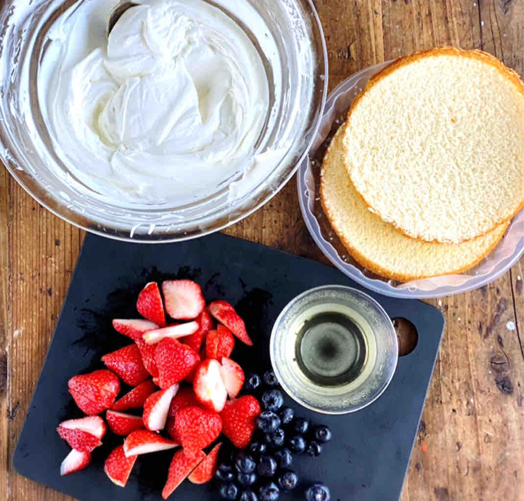 1.●を混ぜてシロップを作る。スポンジは2枚にスライスする。フルーツは食べやすく切る。ボウルに生クリームと砂糖を入れて泡立てる(7〜8分立て)。