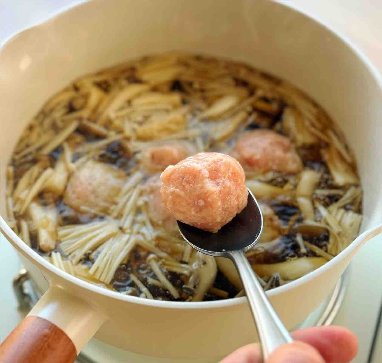 2.鍋にきのこと☆を入れて中火にかける。煮立ったら1の肉だねをスプーンで一口大にすくって落とし入れ、弱めの中火で6〜7分煮る。