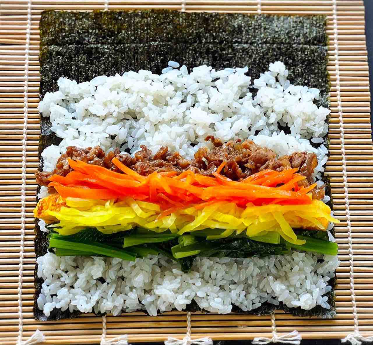 5.巻き簾に海苔を1枚のせ、ごはんの半量を手前から3/4程度のところまで均一に広げる(奥側は空けておく)。1.2.3の具材を半量ずつのせる。