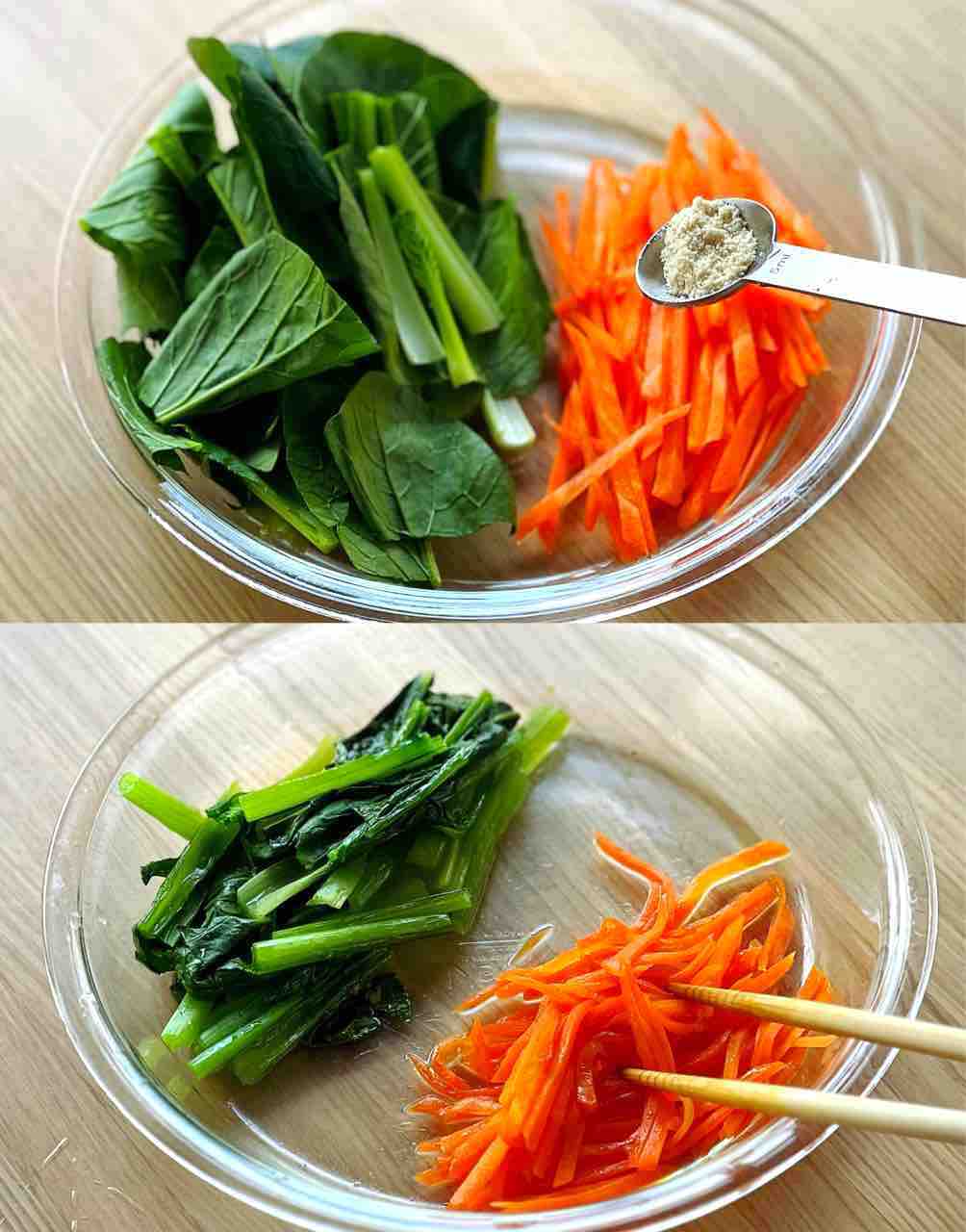 3.人参は細切りにし、小松菜は4cm長さに切る。耐熱皿に並べ、●とごま油小1を振りかける。ふんわりラップして600Wのレンジで3分加熱し、それぞれ混ぜる。