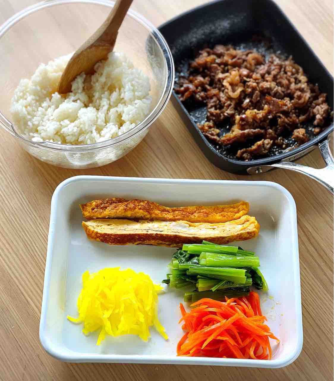 ♦︎今回はフル装備の具を用意しましたが、ナムルを1種類にしたり、たくあんをキムチに代えたりと、お好みでアレンジして下さい♩