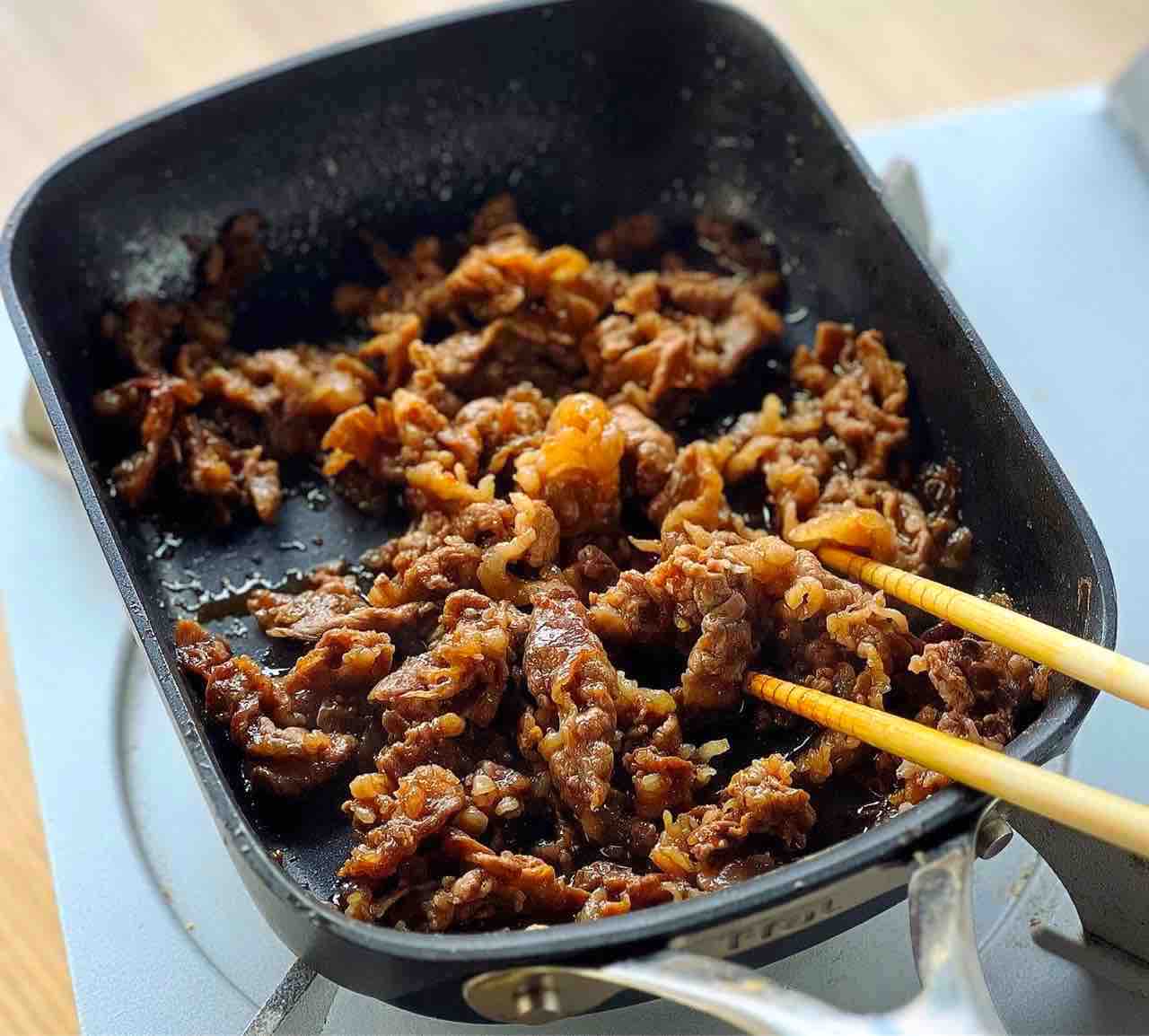 2.1のフライパンにごま油小1を足して中火で熱し、牛肉を炒め、焼肉のたれを加えて煮からめる。たくあんは細切りにする。