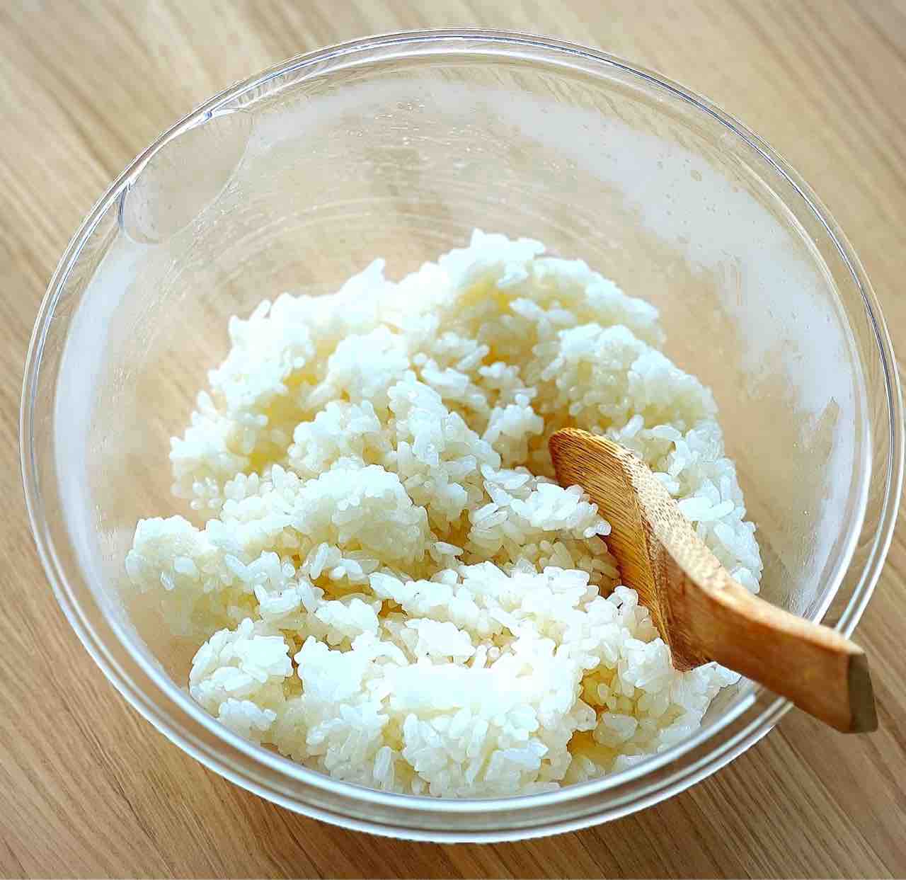 4.ボウルにごはんを入れ、ごま油大1/2、塩小1/4を加えて混ぜる。